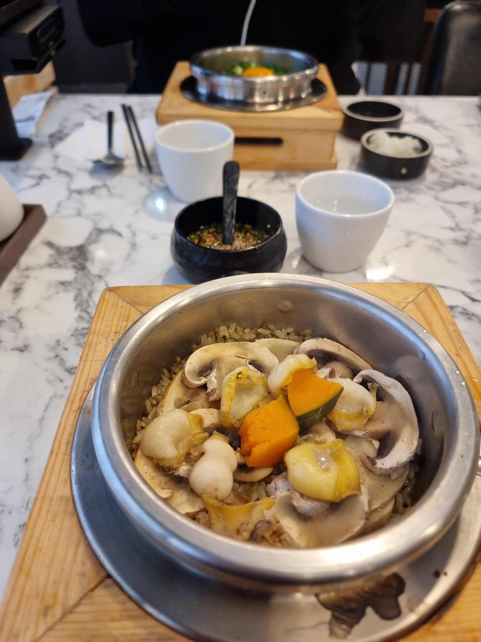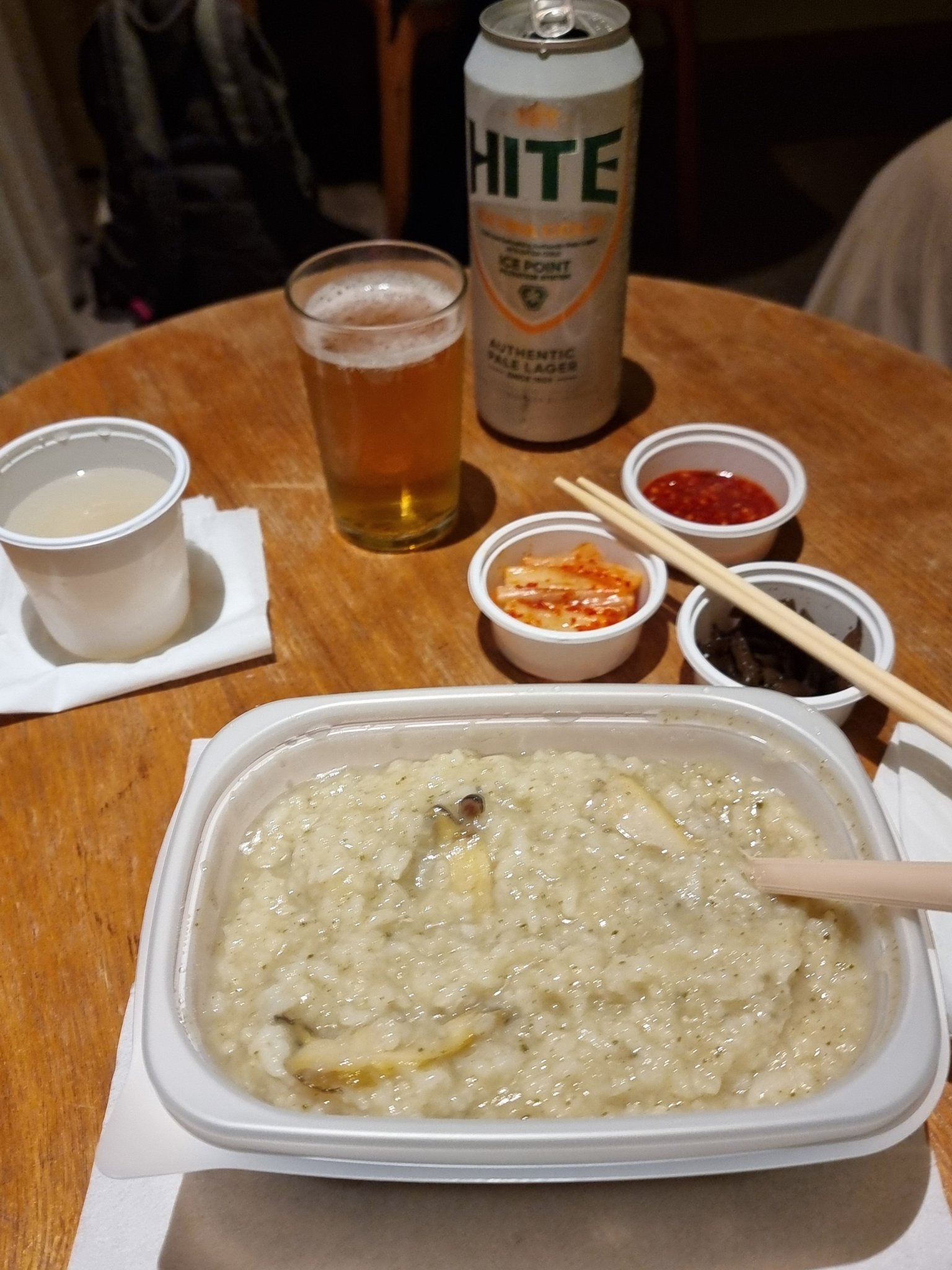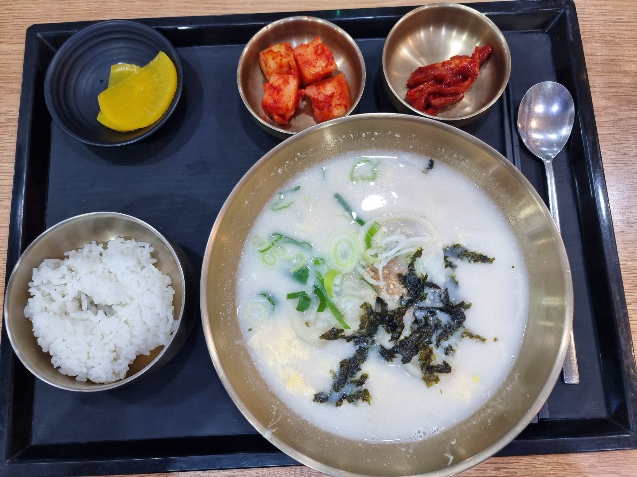 - първото ядене на корейска земя, на летището Гимпо, докато си чаках полета за остров Чеджу. Така и не разбрах какво си поръчах, понеже нямаше меню на английски и се ориентирах по картинките на дисплея. Накратко, беше супа с месо и нещо като омлет, ориз и няколко вида мариновани зеленчуци (банчан). Беше много вкусно, или поне на мен ми се видя така след 12-часов полет и още поне 4-5 часа висене по летища.