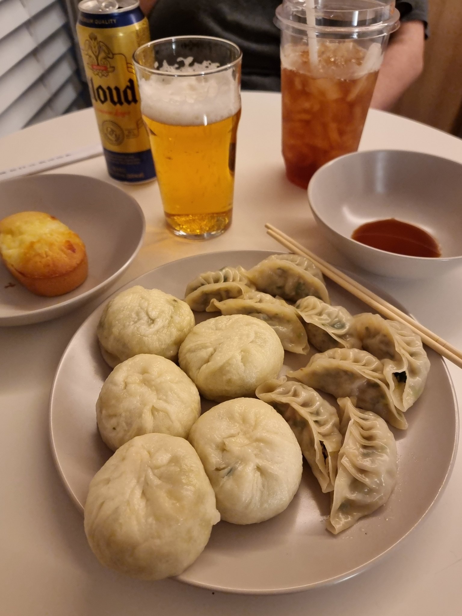 - манду и гьоза за вкъщи, от един уличен щанд близо до хотела ни, отзад се вижда яйчено хлебче (gyeranppang) от друг уличен щанд близо до хотела