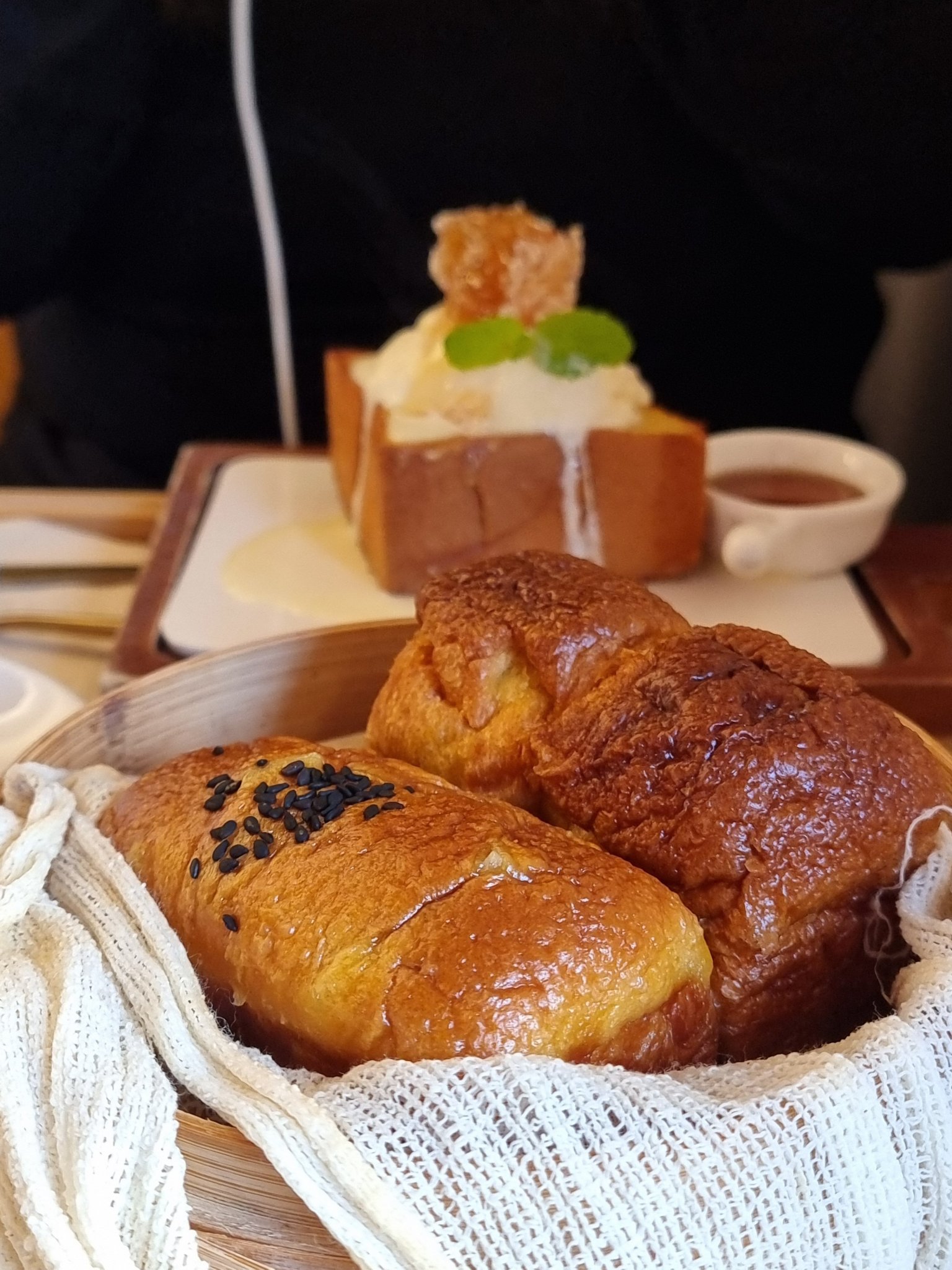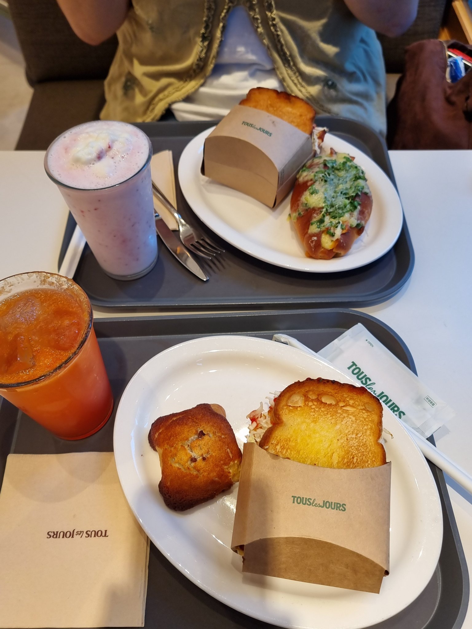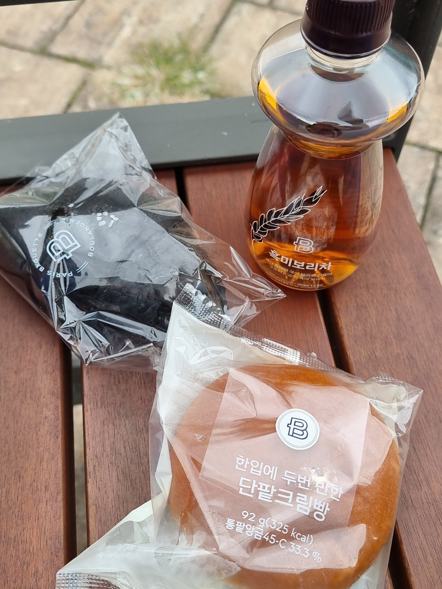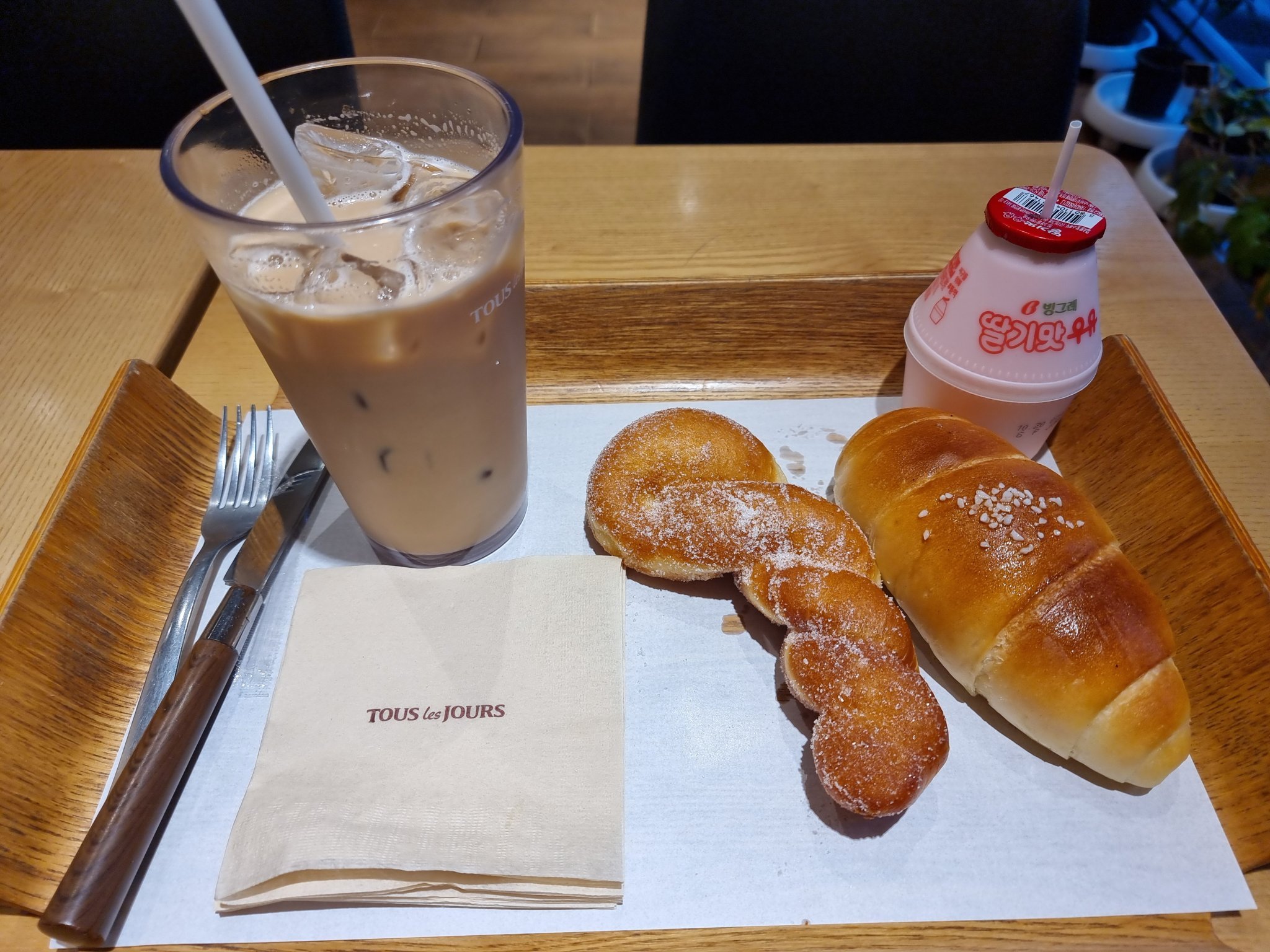 - закуска от верига пекарни - солено хлебче (бриошо-подобно, поръсено с едра сол) и усукана поничка, поръсена със захар (kwakbaeggi)