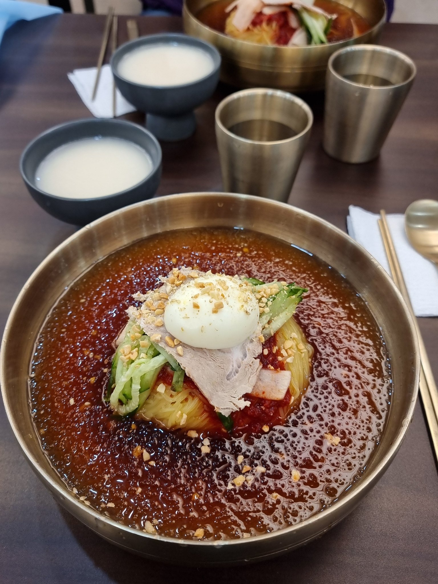 - milmyeon - специалитет от Бусан, дошъл от север с бежанците по време на Корейската война - гнездо от тънки нудъли, студен лек и не много пикантен бульон, малко зеленчуци, шунка и яйце