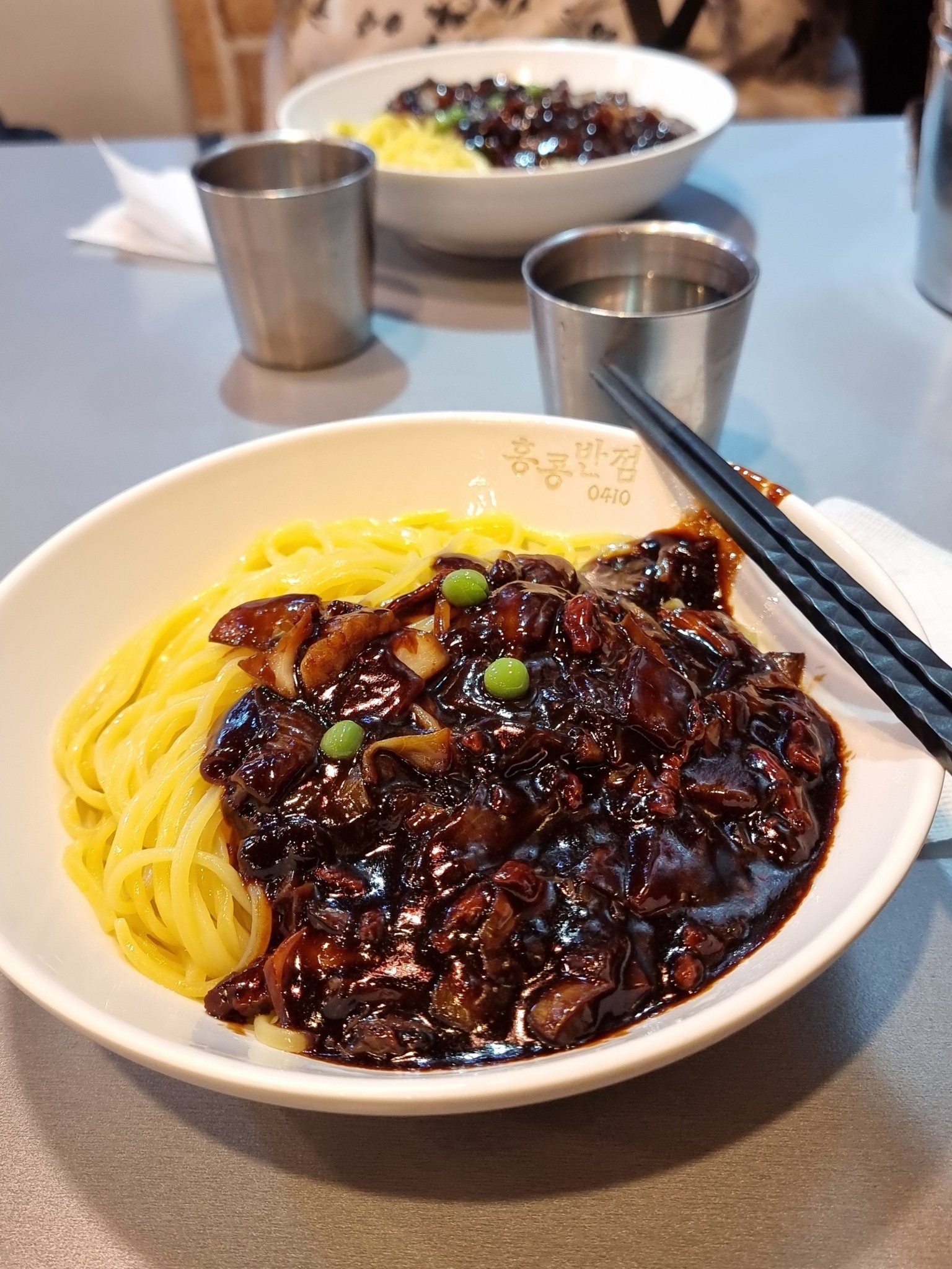 - jjajamgmyeon - нудъли в сос с паста от черен боб. Със задоволство установих, че тези, които приготвям вкъщи, не се различават съществено от тези на място 😇
