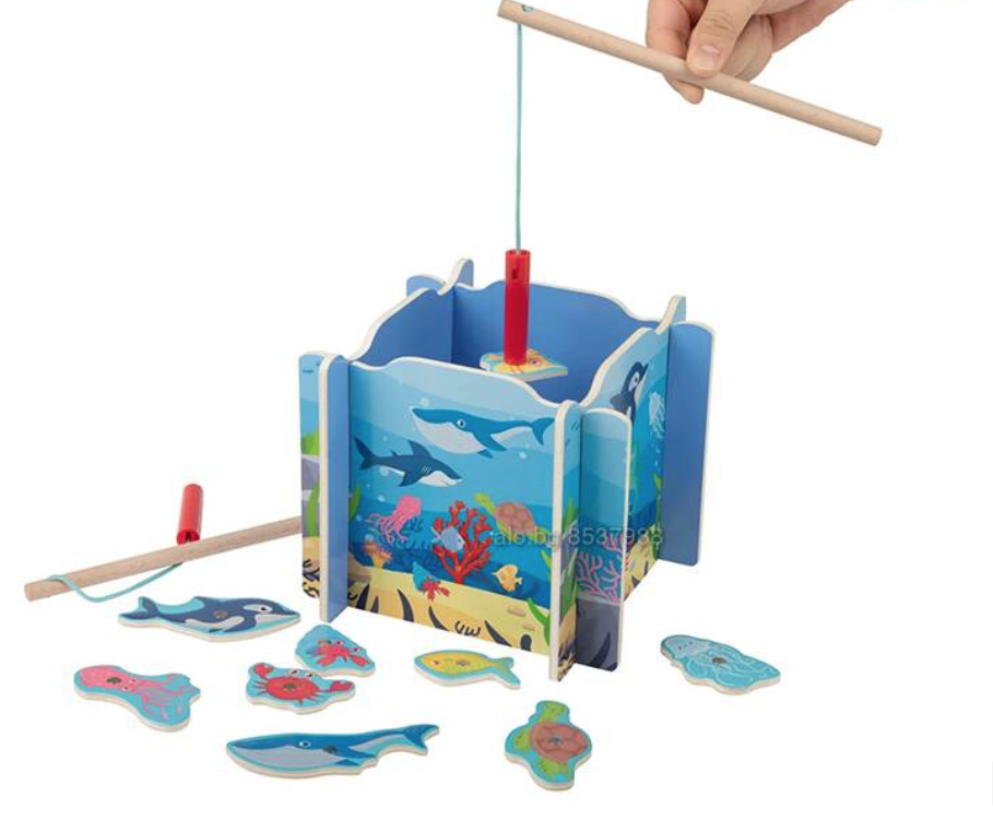 Подреждам всички рибки до "аквариума" и карам малката с въдицата да ги хваща (всяка фигурка има малко магнитче в средата) и да ги връща в аквариума. Много добре се справя.