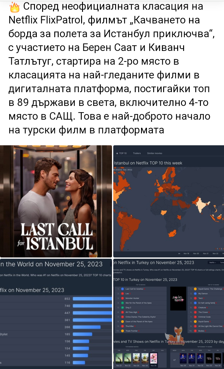 Здравейте, дами! Вчера след работа изгледах "Последно повикване до Истанбул". Филмът беше лек, макар и обратът да ме изненада. След толкова години Къванч и Берен изглеждат все толкова красиви. Личи си, че им е спокойно да снимат заедно и някак си с лекота играят. Показаха една сладка любов, която накрая победи. Единственото, което не ми хареса (мое мнение) беше така обсъжданата любовна сцена - някак си не видях онази страст от Бехлюл и Бихтер. Не беше пожарът, който те могат да сътворят. Пеперудите в стомаха ги нямаше. Например, ако някоя от вас е гледала Шахмаран със Серенай, сцената на езерото беше огън. Дори танцът на Аслан и Девин ми донесе повече наслада на сетивата. Но все пак това е съвсем друг филм.