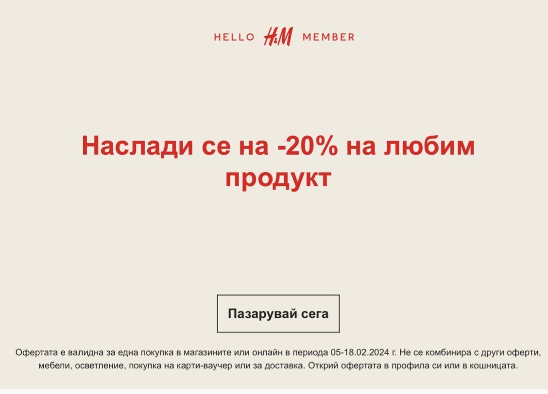 Магазините на H&M приемат връщания на стари дрехи, независимо от марката и състоянието им. Те предлагат талон за 10% отстъпка за продукт по избор при следващата покупка. За да върнете артикул, той трябва да е в торба с размер на средна чанта и да не съдържа бельо или обувки. Можете да замените само закупената дреха със същата, но различен размер или цвят. Талонът за отстъпка е валиден 6 месеца и кампанията е целогодишна, важи за всички магазини в България и няма краен срок.