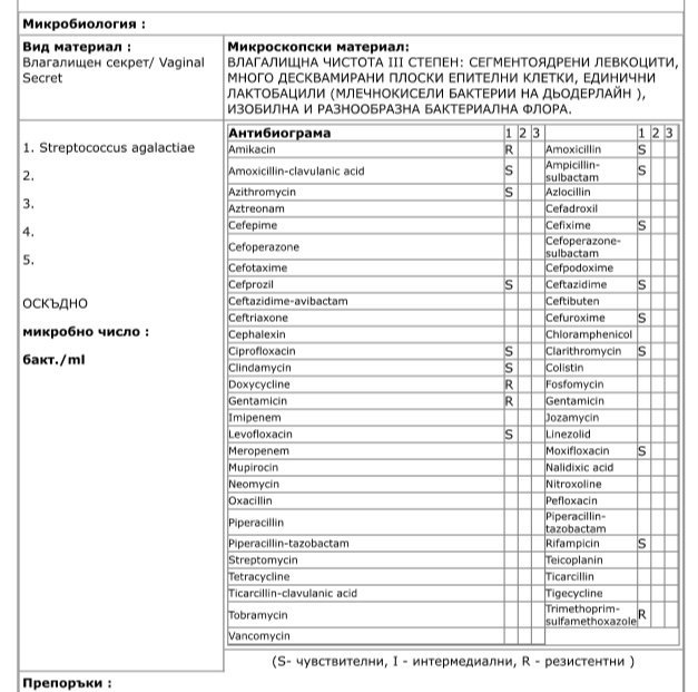 Не знам първото изследване с антибиограмата откога е,но там има бактерия,а не гъбички.Последното изследване е ок,само нямате лактобацили.