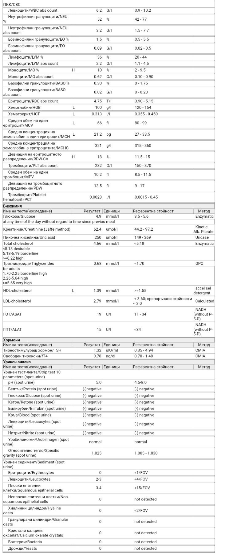 Здравейте, д-р Въндева, благодаря за отговора. Днес си пуснах ТСХ и ФТ4 . Ще приложа изследванията + ПКК. Според изследванията са в норма хормоните. Малко се чудя,че ФТ 4 е почти на долна граница. Също впоследствие се притесних,че около час преди взимането на кръв бях изпушила 1 цигара,даже не цяла. Дали не е оказало влияние на резултата?