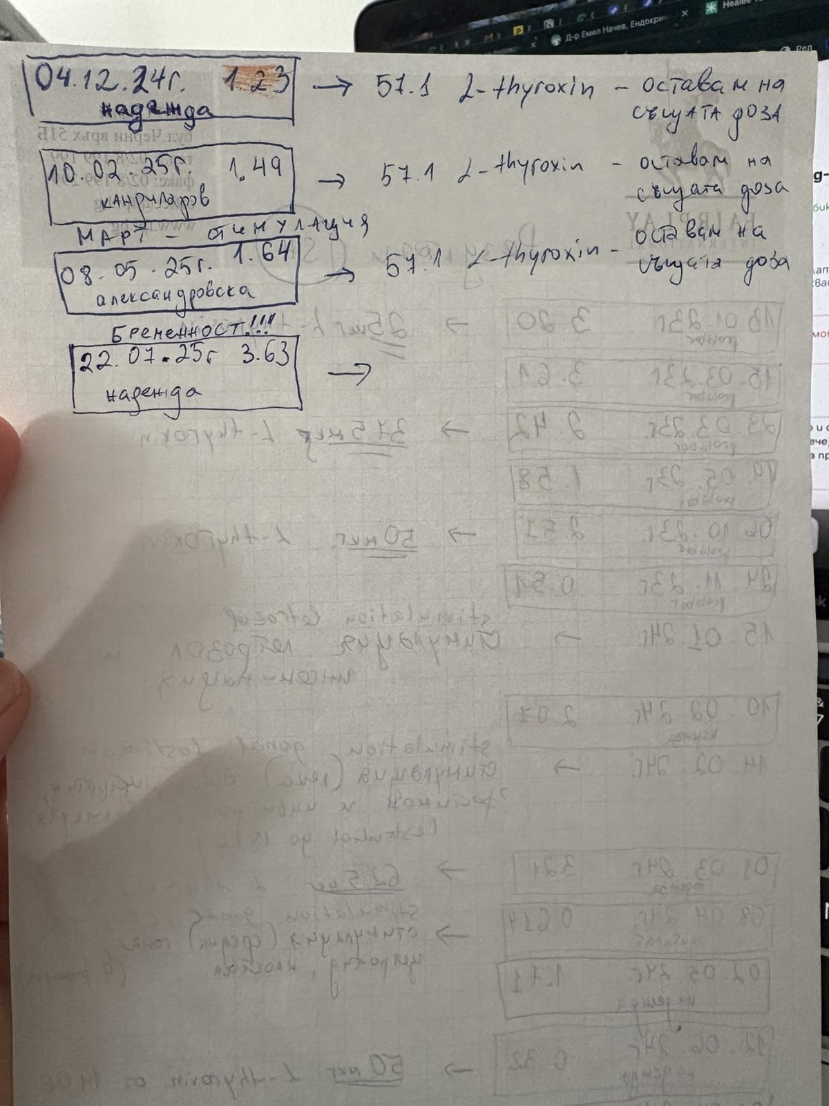 Здравейте, Hansy! Препоръчвам при бременност да има специалист, който да Ви следи на живо. Проследе ТСХ и фТ4 след 1 месец.