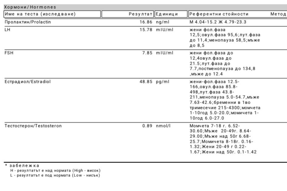 Здравейте, може ли да коментирате резултатите? Вижда се ,че LH e високо, и ендокринолога при когото отидох ми каза, че е индикация за поликистозни яйчици. Аз до момента нямам открити кисти.