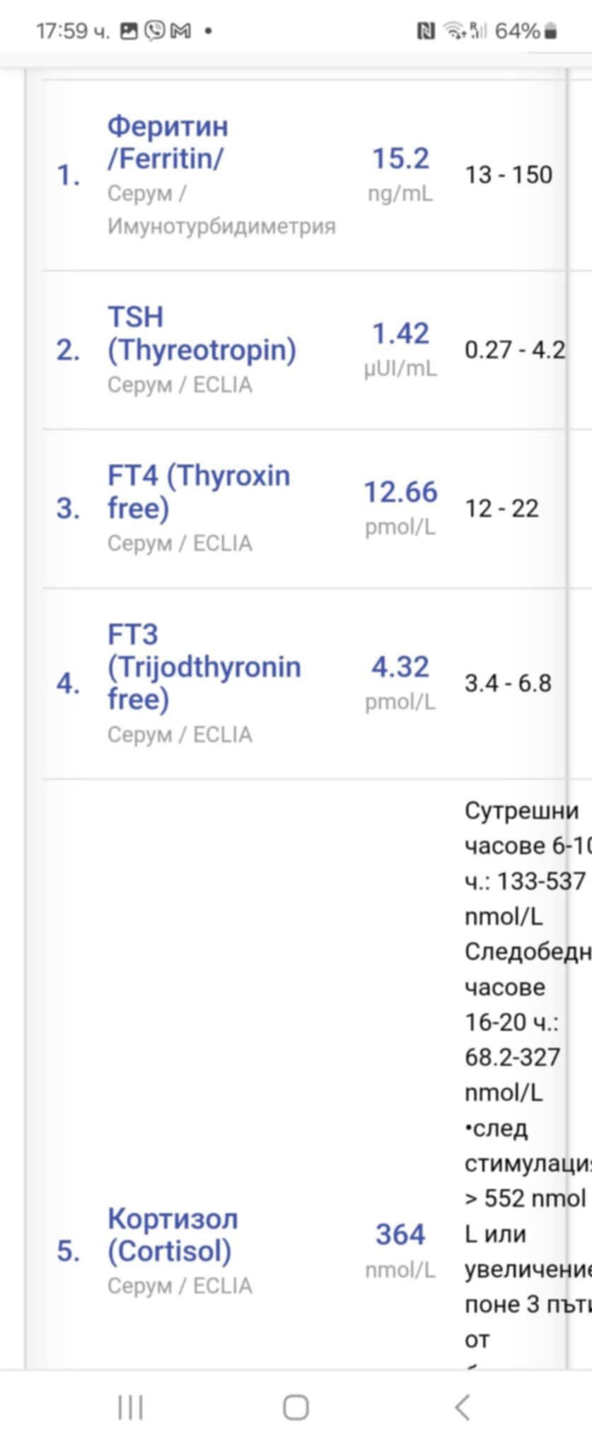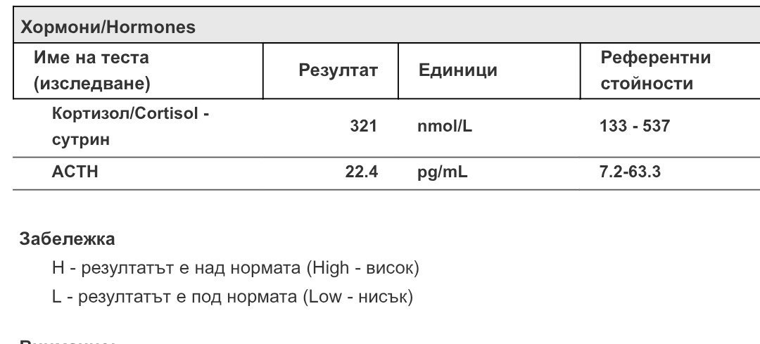Здравейте, може ли коментар по отношение на прогресивно падащ кортизол, за който ваши колеги не взеха отношение. Имам Хашимото и пиех ниска доза хормон (37,5мг/или 25мг) от години, спрях го преди 3 месеца, защото фт4 ми беше много над границата, а т3 около 3,6. Тсх непрекъснато ми вариваше през годините между 1,8-3,5. Кортизола ми падна след спирането. Но назад в годините преди да почна хормон също ми е бил нисък (около 200). Какъв може да е проблема при мен? Имам много симптоми- ниски кръвно, надкамерни тахикардии при движение, слабост, болки, инвалидизираща умора, трудно заспиване, много подут стомах и ниска стомашна киселина в жлъчен рефлукс и атрофичен гастрит.. В момента не се лекувам с нищо, освен с вит Д, който вече ми е в норма.