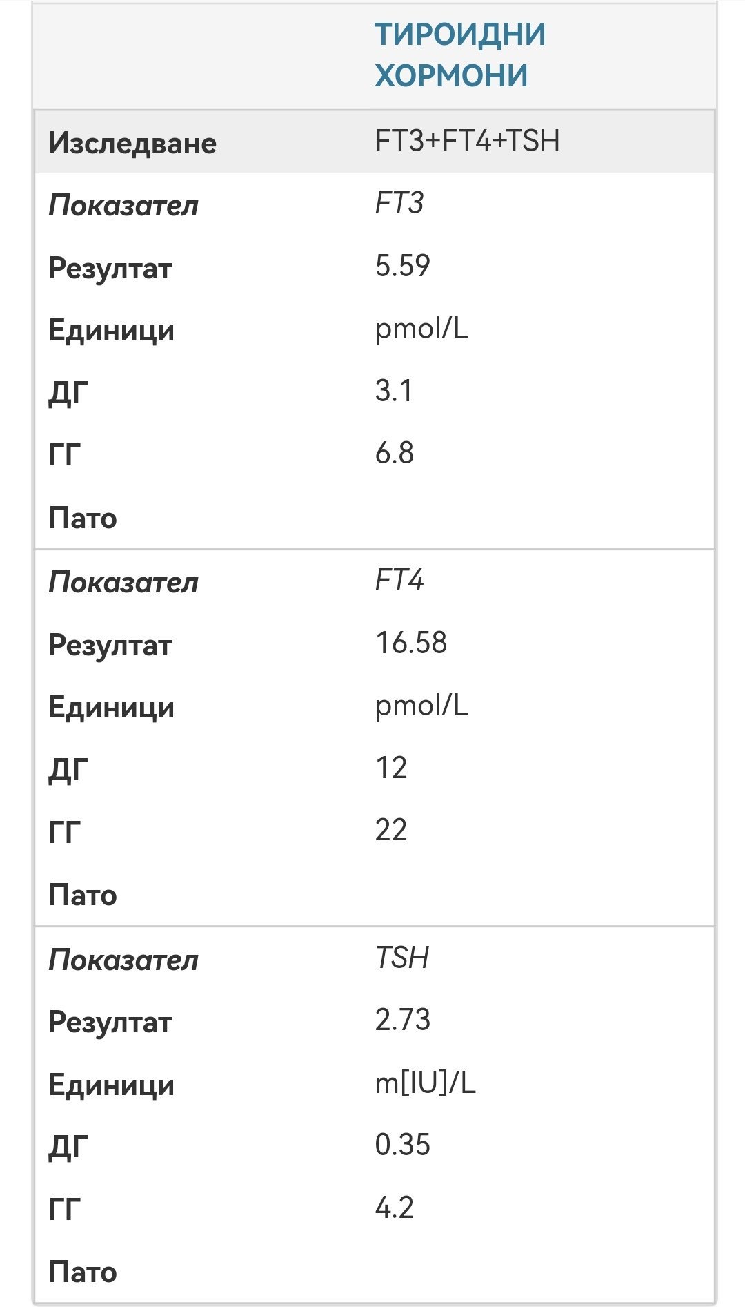 Здравейте, Ники! Резултатите са като за хипотиреоидизъм. Ако нямате оплаквания и за пръв път се установяват такива нива на тиреоидните хормони, повторете изследванията след 2-3 месеца, да се включат и антитела - ТАТ, анти-TPO. Добре е да се направи и ехография на щитовидната жлеза. Понякога има преходни нарушения, обикновено след вирусни инфекции, при които преди пълното възстановяване на жлезата има подобни стойности. От друга страна, ако хормоните остават без промяна и има данни за автоимунен процес, може да се обсъжда заместваща терапия.