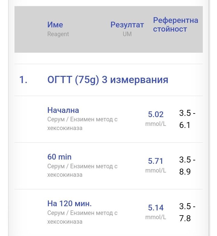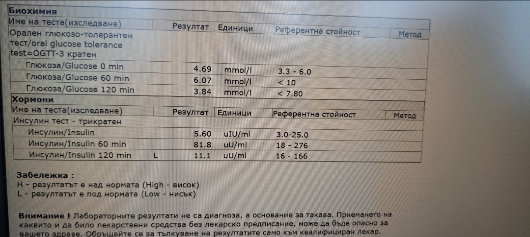 Има лека инсулинова резистентност (инсулинът отскача повече на първия и втория час) без нарушения в стойностите на кръвната захар.