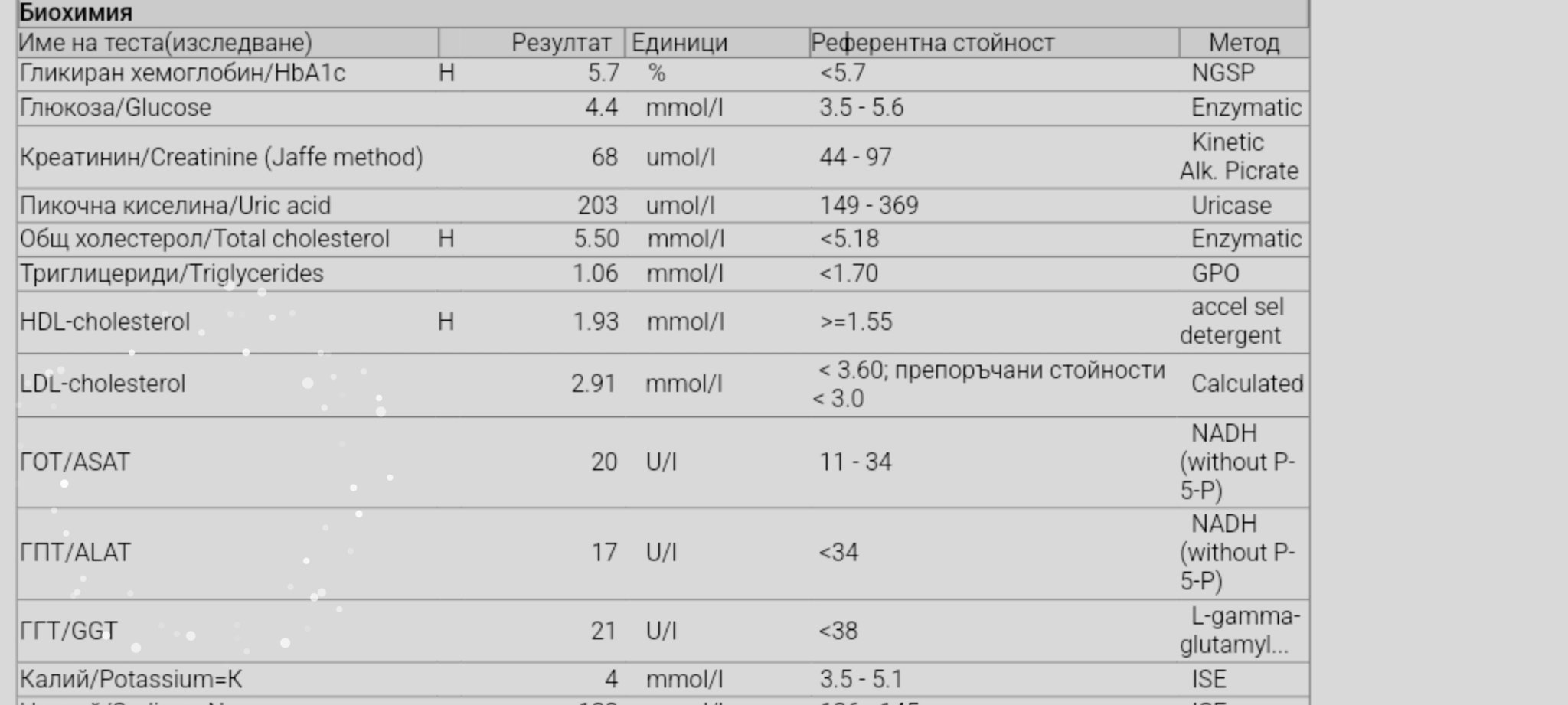 Холестерол - общ ( Total Cholesterol )   ↑   5.52   mmol/l   До 5.20