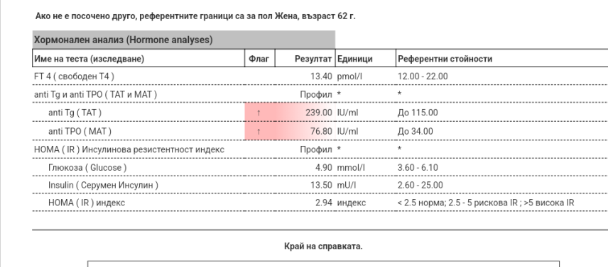 Здравейте, Веска! Има данни за инсулинова резистентност. Няма спешност, организирайте си консултация с ендокринолог, за да обсъдите как да оптимизирате храненето и дали има нужда от включване на метформин.