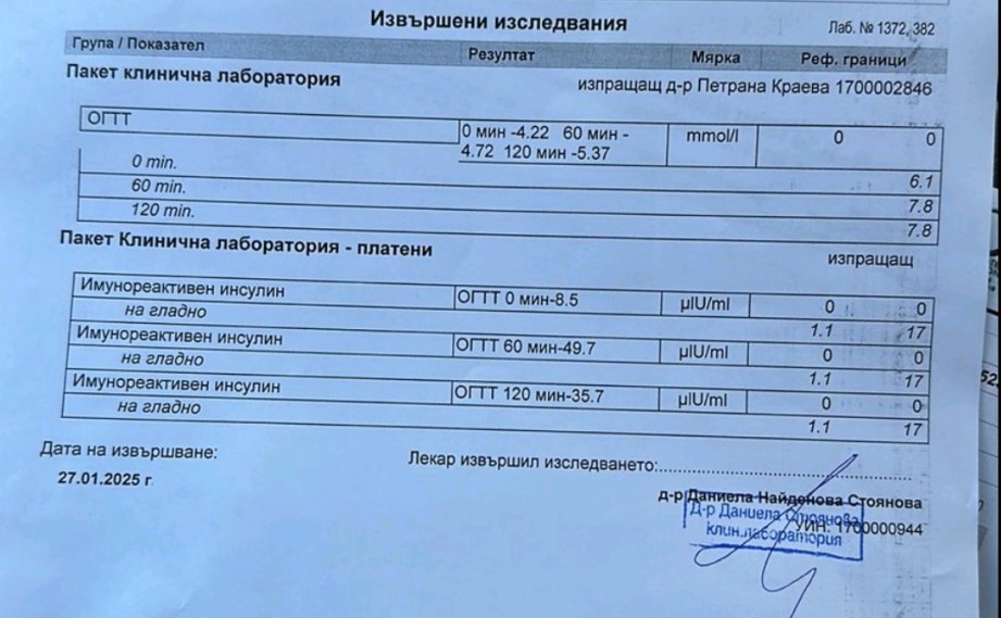 Здравейте без да имам конкретни оплаквания си пуснах това изследване , натоварване с глюкоза. Жена на 38 години съм, 67 килограма. Бихте ли ми казали какво показват резултатите ? Виждам , че са извън референтните стойности на къде трябва да се насоча ?