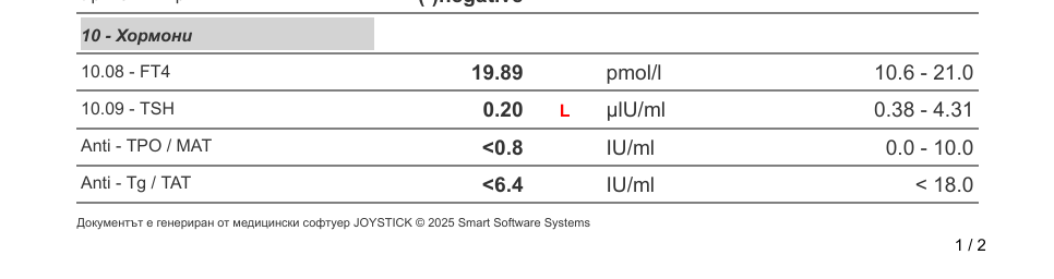 Здравейте, д-р Въндева, благодаря за отговора. Днес си пуснах ТСХ и ФТ4 . Ще приложа изследванията + ПКК. Според изследванията са в норма хормоните. Малко се чудя,че ФТ 4 е почти на долна граница. Също впоследствие се притесних,че около час преди взимането на кръв бях изпушила 1 цигара,даже не цяла. Дали не е оказало влияние на резултата?