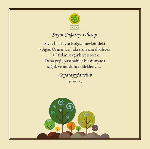 Уважаеми Çağatay Ulusoy. 33 фиданки, които ще бъдат засадени за вас в 7-те дървесни гори в Tavra Boğaz, провинция Sivas, ще растат с любов. С пожелание за здраве и щастие в един по-зелен свят, подходящ за живеене.. Cagatayyfanclub