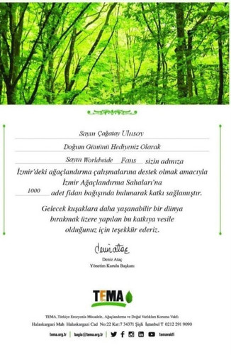 Уважаеми Çağatay Ulusoy Като ваш подарък за рожден ден, феновете на Serm Worldwide допринесоха от ваше име, като дариха 1000 фиданки на полетата за залесяване на Измир, за да подпомогнат усилията за залесяване в Измир. Вие играете важна роля в този принос, за да оставите един по-приятен за живеене свят към бъдещите поколения. Благодаря ти !