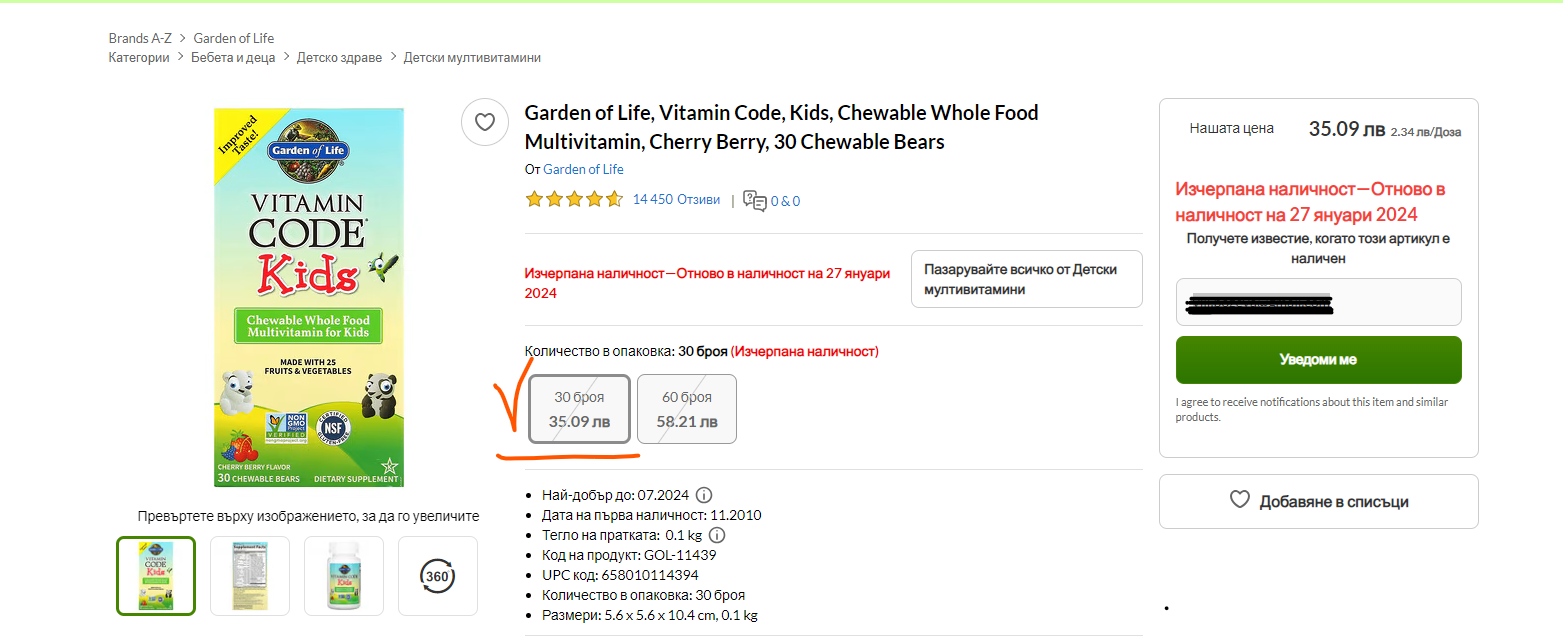 Като добавка към дамата за детските мултивитамини по-горе - на по-малката опаковка на витамините от 30 бр. при мен пише, че скоро ще имат наличност: Отново в наличност на 27 януари 2024, така че може да изчакате и да вземете по-малката опаковка. Мултивитамините наистина са много хубави и дечко не случайно ги е харесал Blush