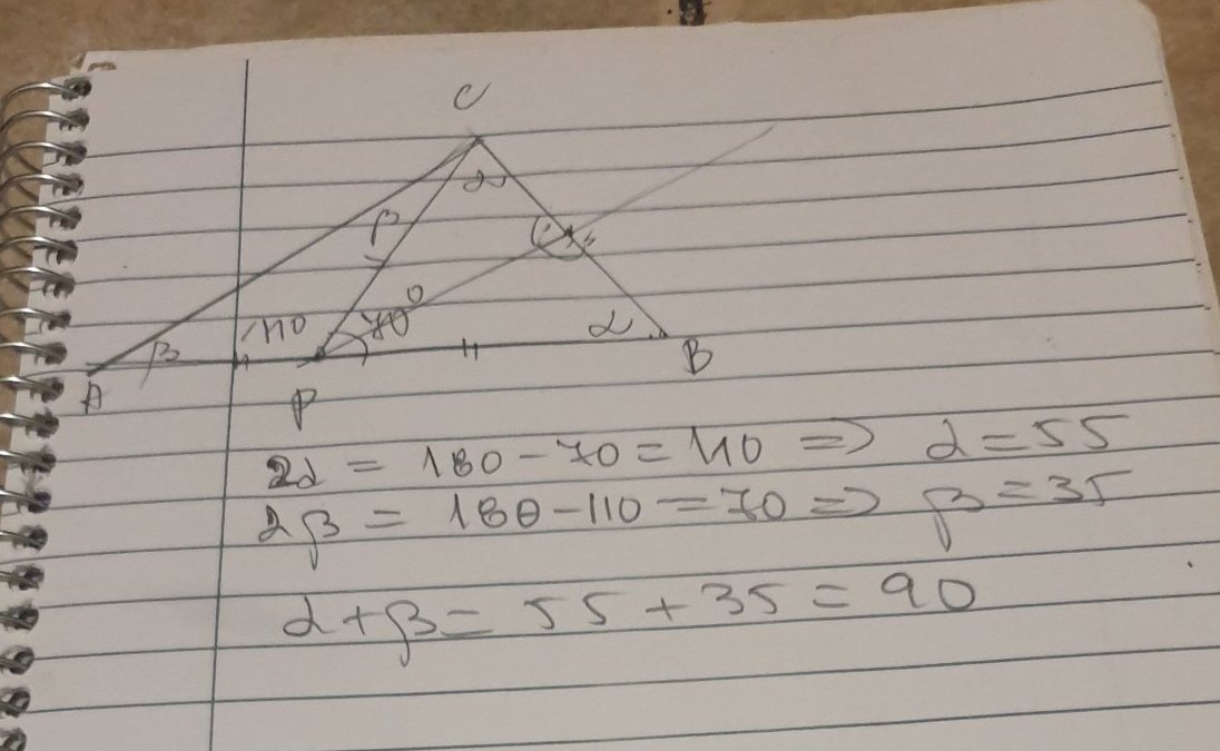 От  триъгълник AIB намерете с косинусова теорема cos α и cos β и ги използвайте в големия триъгълник ABC с cos 2α и cos 2β