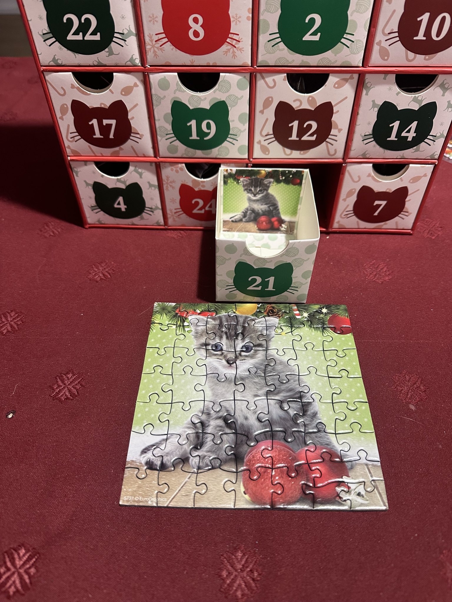 Имах един и той беше смесен, всички части заедно като един пъзел, но 12 отделни, наредих си го стандартно само гледах да завърша едно пъзелче  и чак тогава друго. Прибрах си го и още не съм го снимала, нямам аз такава самодисциплина да чакам ден по ден.