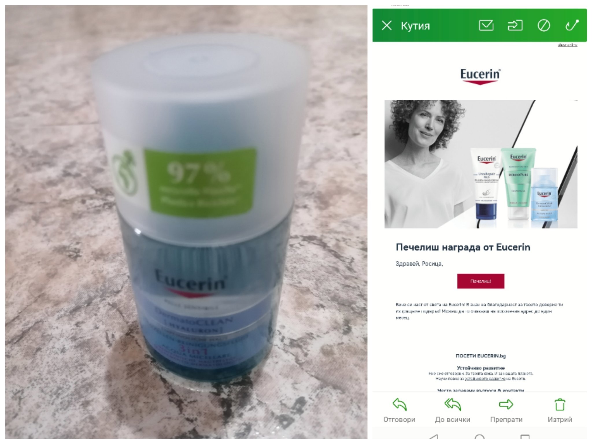 Преди малко получих награда от Eucerin мицеларна вода. Бях сигурна, че съм от първите 100, веднага се регистрирах след обявяване. Може ли да споделите дали снимката от имейла беше с 3 продукта или само с 1. Моя е от 16.11.23г 14:31ч