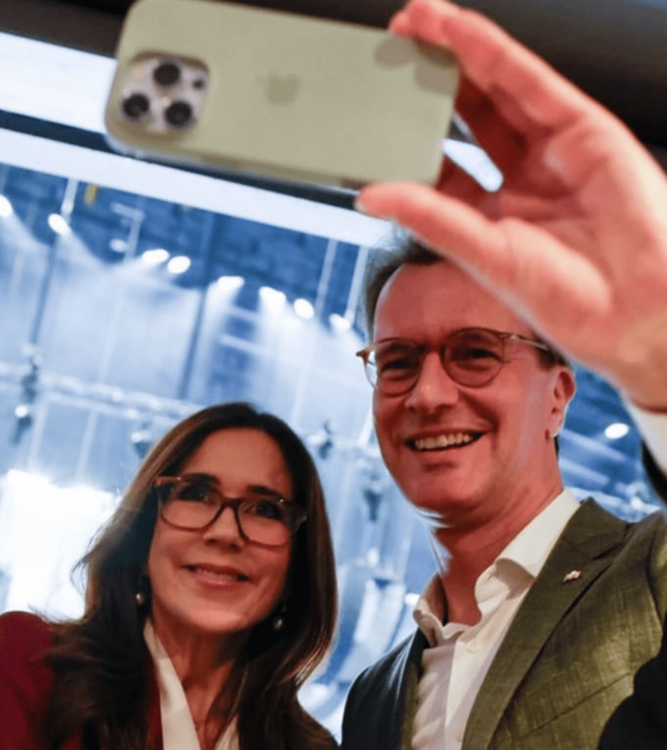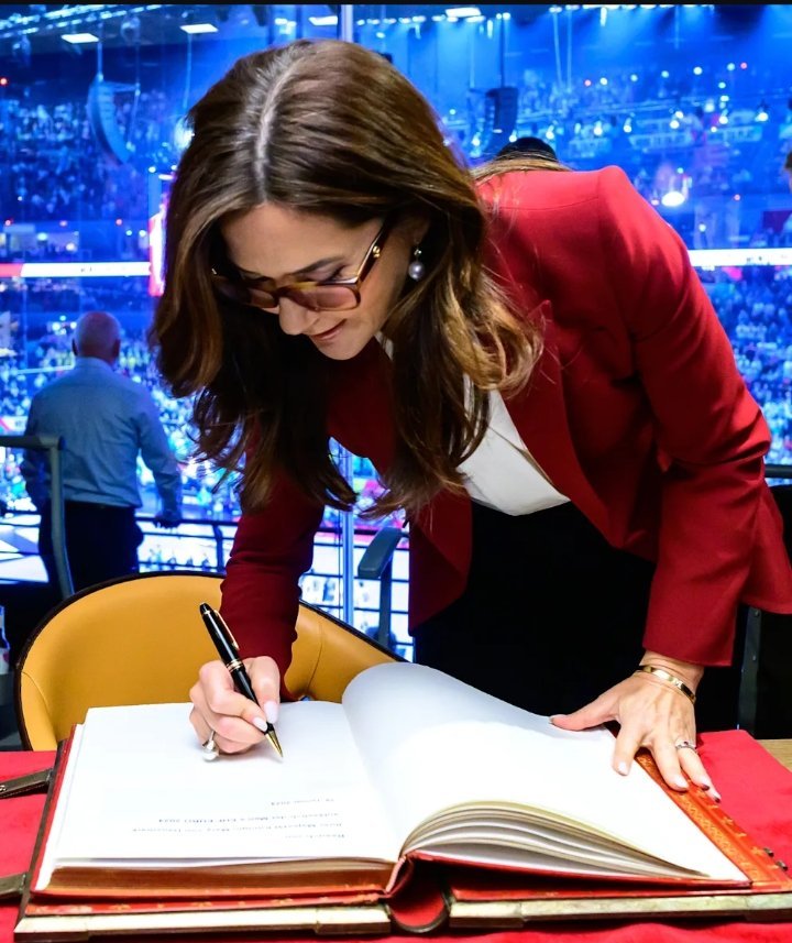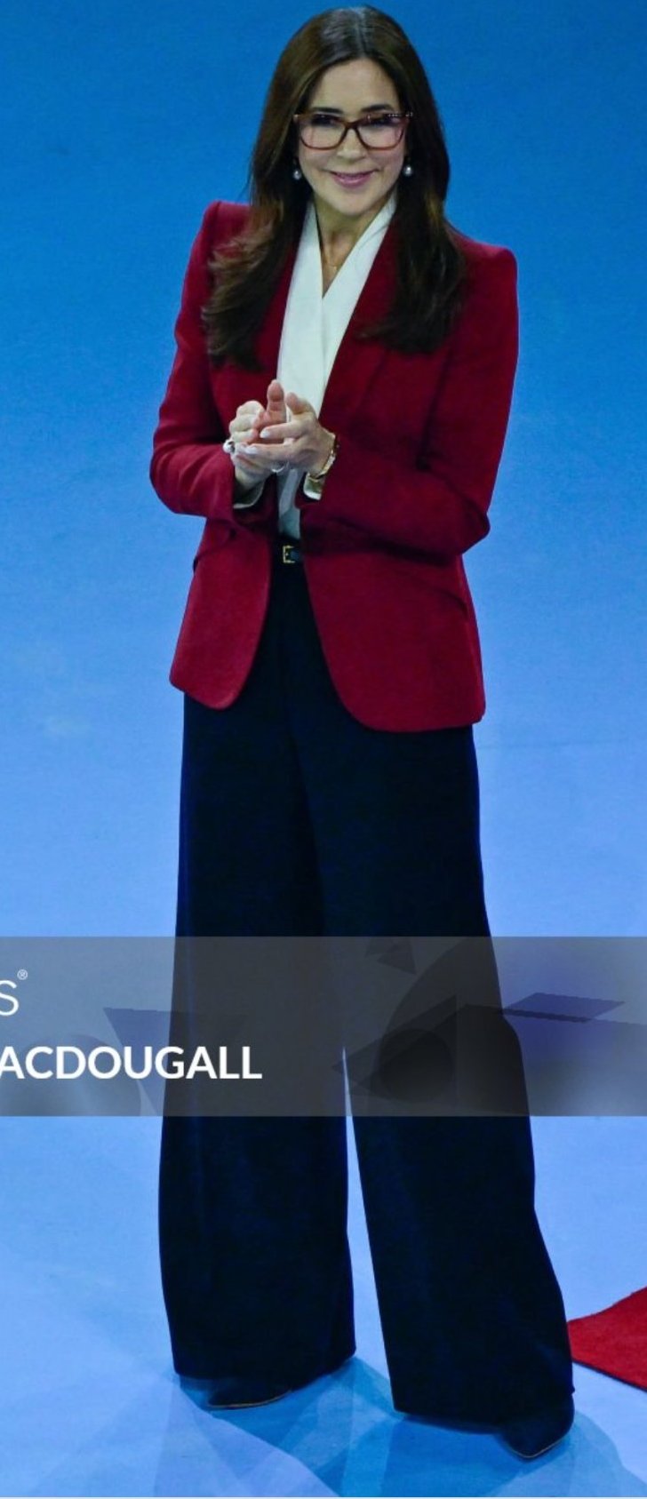 Много е хубава кралицата, харесва ми, че хем е с цветовете (уж) на датския флаг, хем е ненатрапчиво, по-тъмно червено сако, черен панталон. Панталонът много ми харесва. Доста носи широки панталони, добре ѝ се получава. Хубави перли, сивеят на снимката, дали са така наистина?