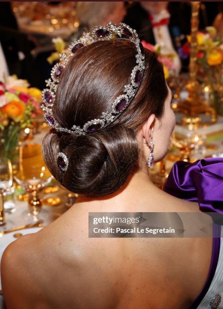 Тиарата включва големи лилави аметисти, заобиколени от диамантени клъстери в злато и сребро.