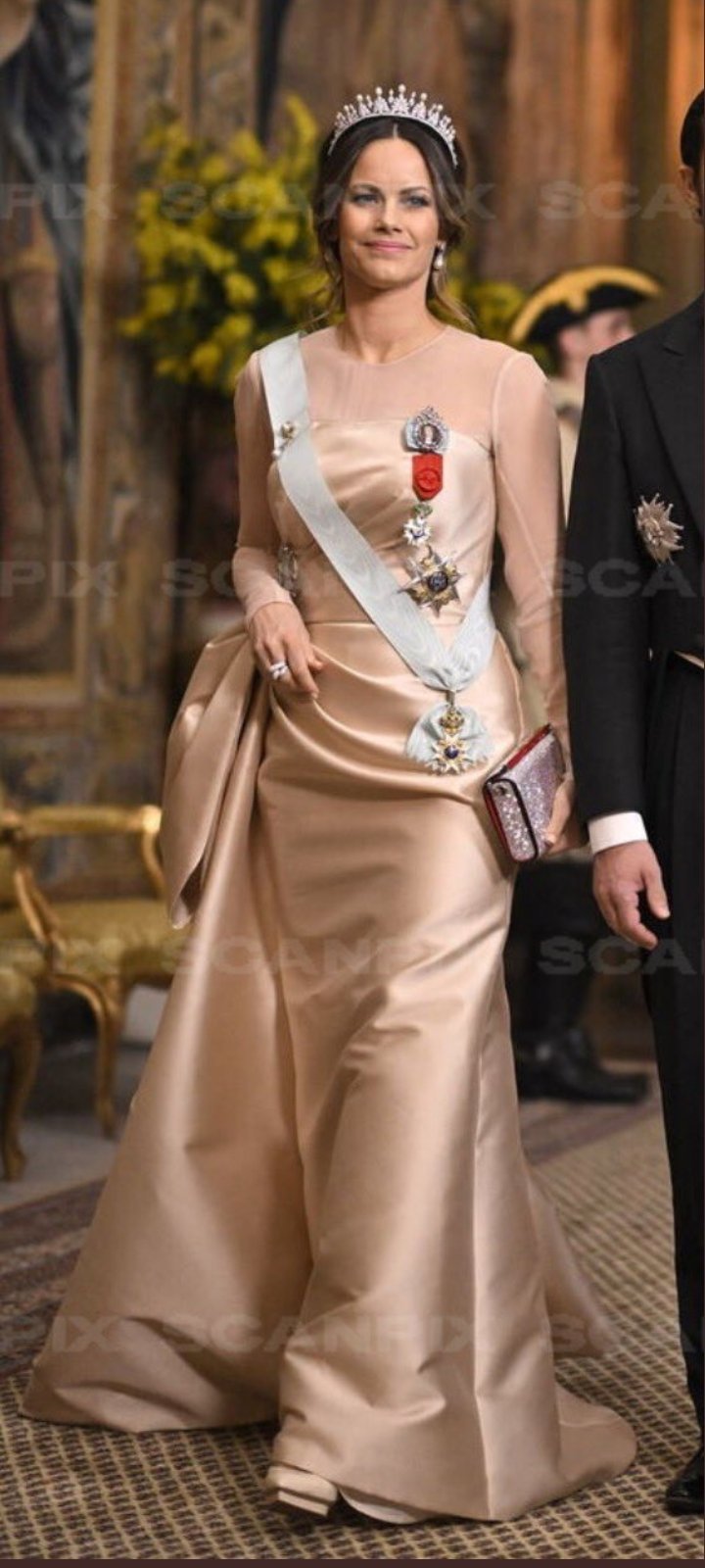 Силвия очаквано носи Cameo Parure, която първоначално е била подарена от Наполеон I на императрица Жозефина през 1809 г. Комплектът включва тиара, огърлица, гривна и чифт обеци .