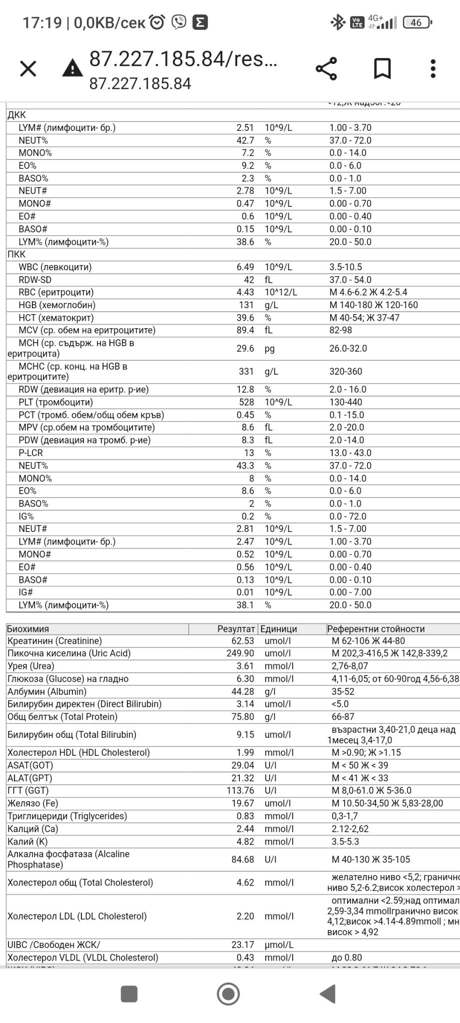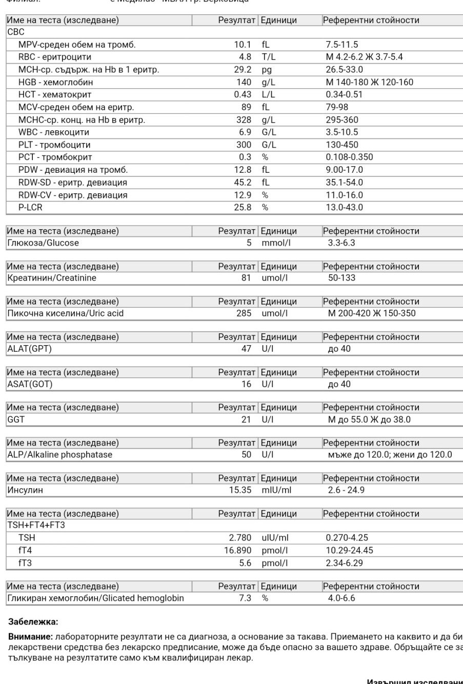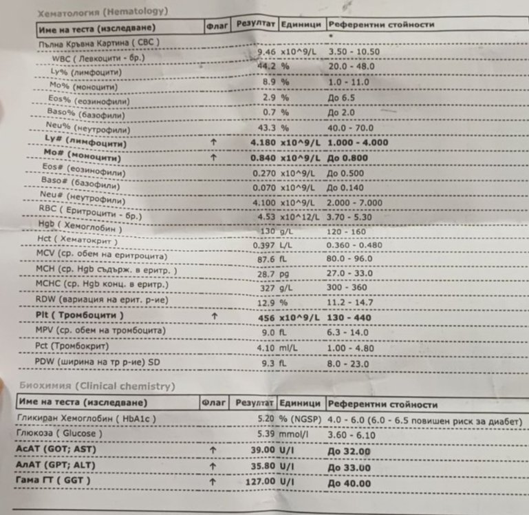 Резултатите показват, че холестеролът е в нормални граници, а съотношението триглицериди-HDL е благоприятно. Това показва нисък риск от сърдечно-съдови инциденти. Важно е да се игнорират стойностите, отбелязани като „HIH“, тъй като те не са от значение. Препоръчително е да се ограничи консумацията на въглехидрати и алкохол, за да се намали маркерът ALT. Също така, скорошна коремна ехография се препоръчва.