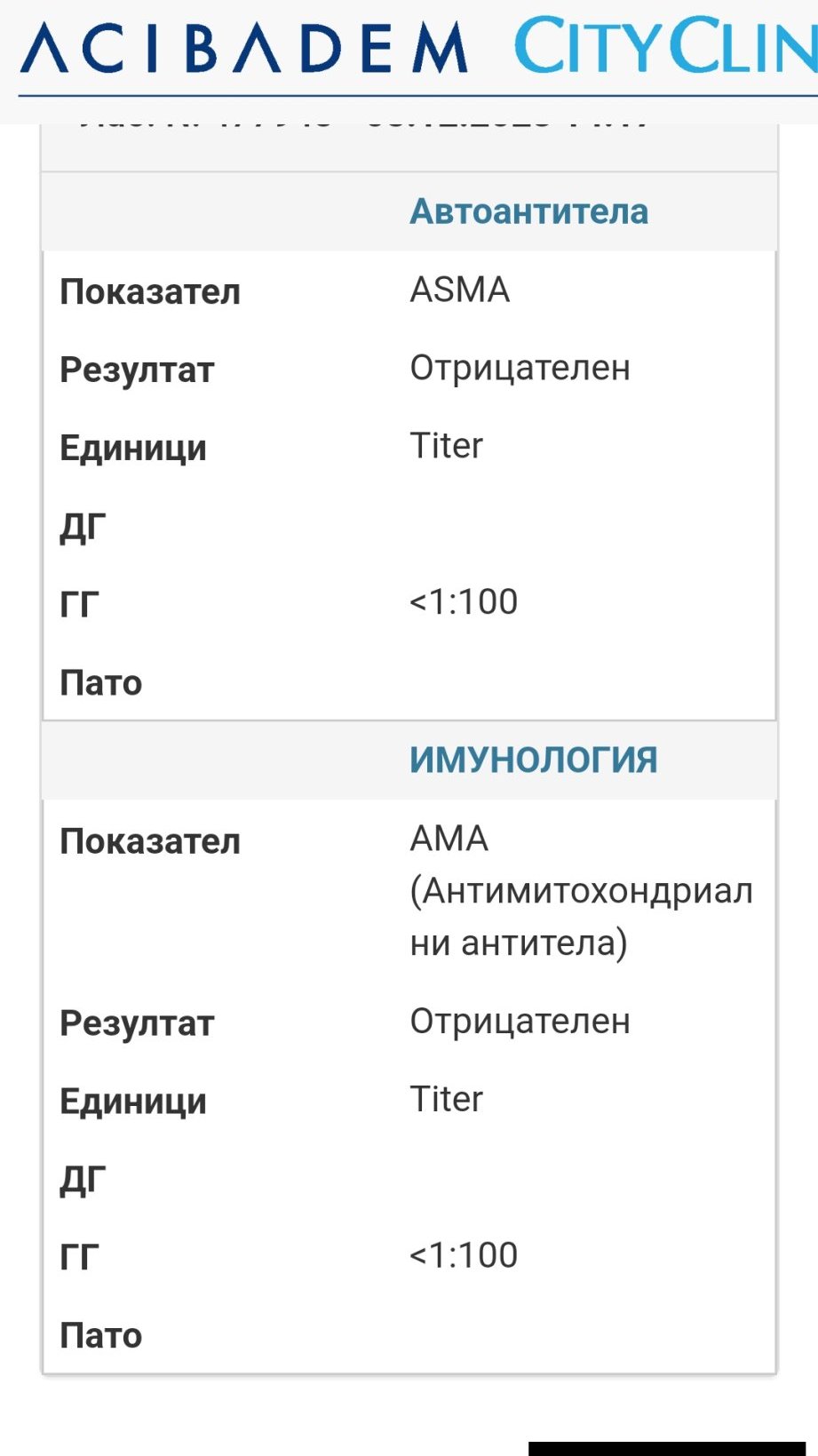 ОК, автоимунни заболявания на черния дроб и жлъчните пътища не е, което не е маловажно. Останалите изследвания ще дадат още отговори. Фиброскан правен ли ви е? Ако не е, попитайте ги дали могат да ви го направят.