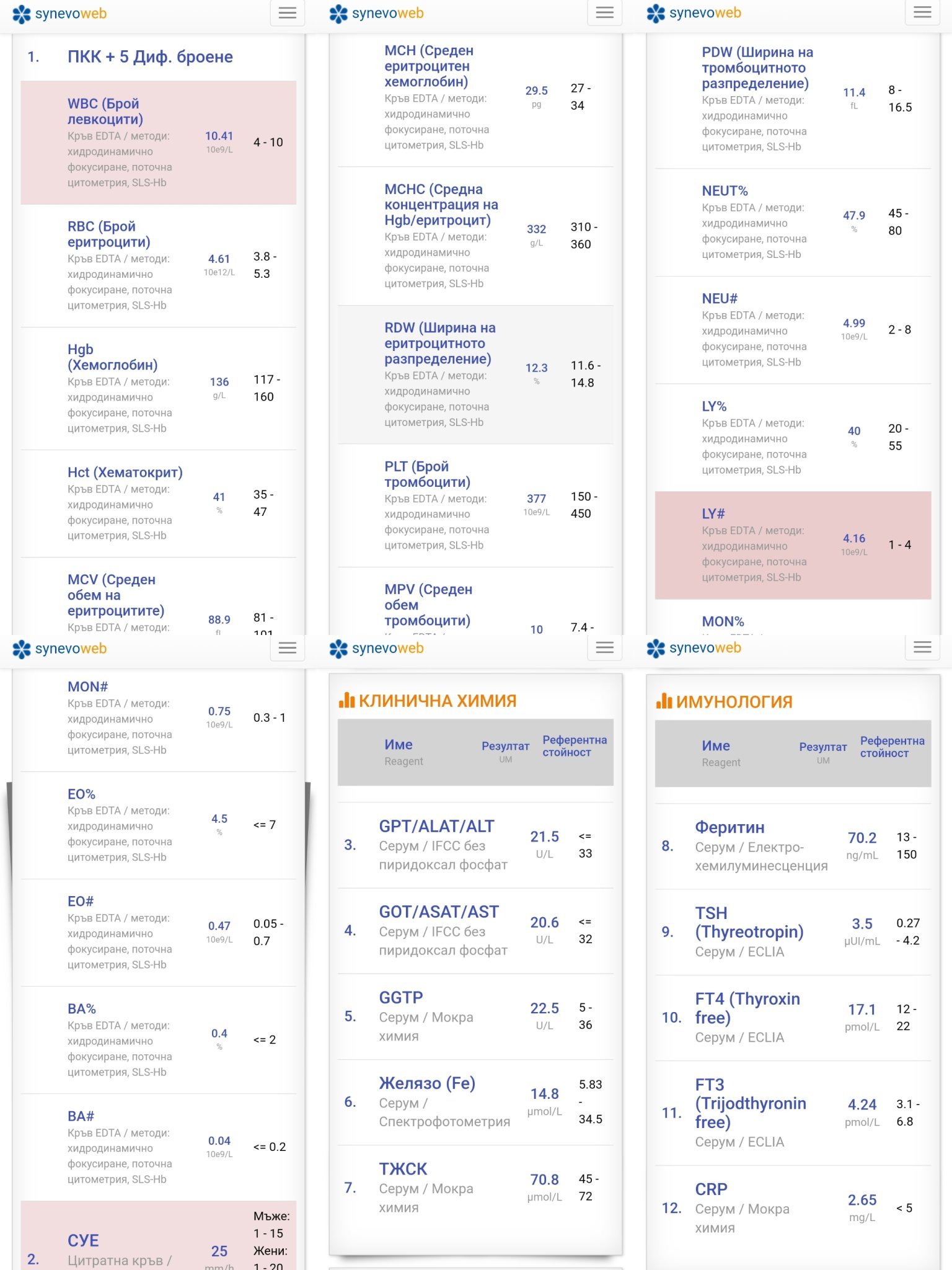 Проследявам ЩЖ заради хипофункция. На 50 мкг еутирокс съм. Правих изследвания днес и преди два месеца. Всъщност ме притесняват повишените лимфоцити и СУЕ и сега, и преди два месеца. СУЕ беше 32, лимфоцити % - 41,3. Желязо, ЖСК и феритин добре ли са?