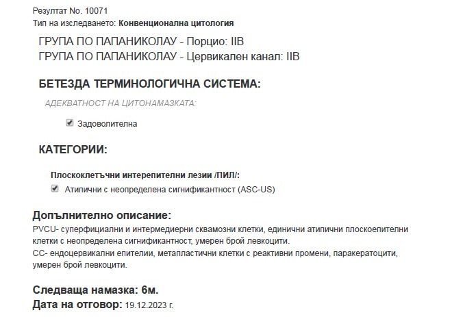 Има данни за абнормално образувание на повърхността на маточната шийка, което може да е доброкачествено, пред-раково или раково. Настоящият тест не може да определи дефинитивно и вероятно ще ви направят друг, за да се конкретизира дали има вредна патология или не.