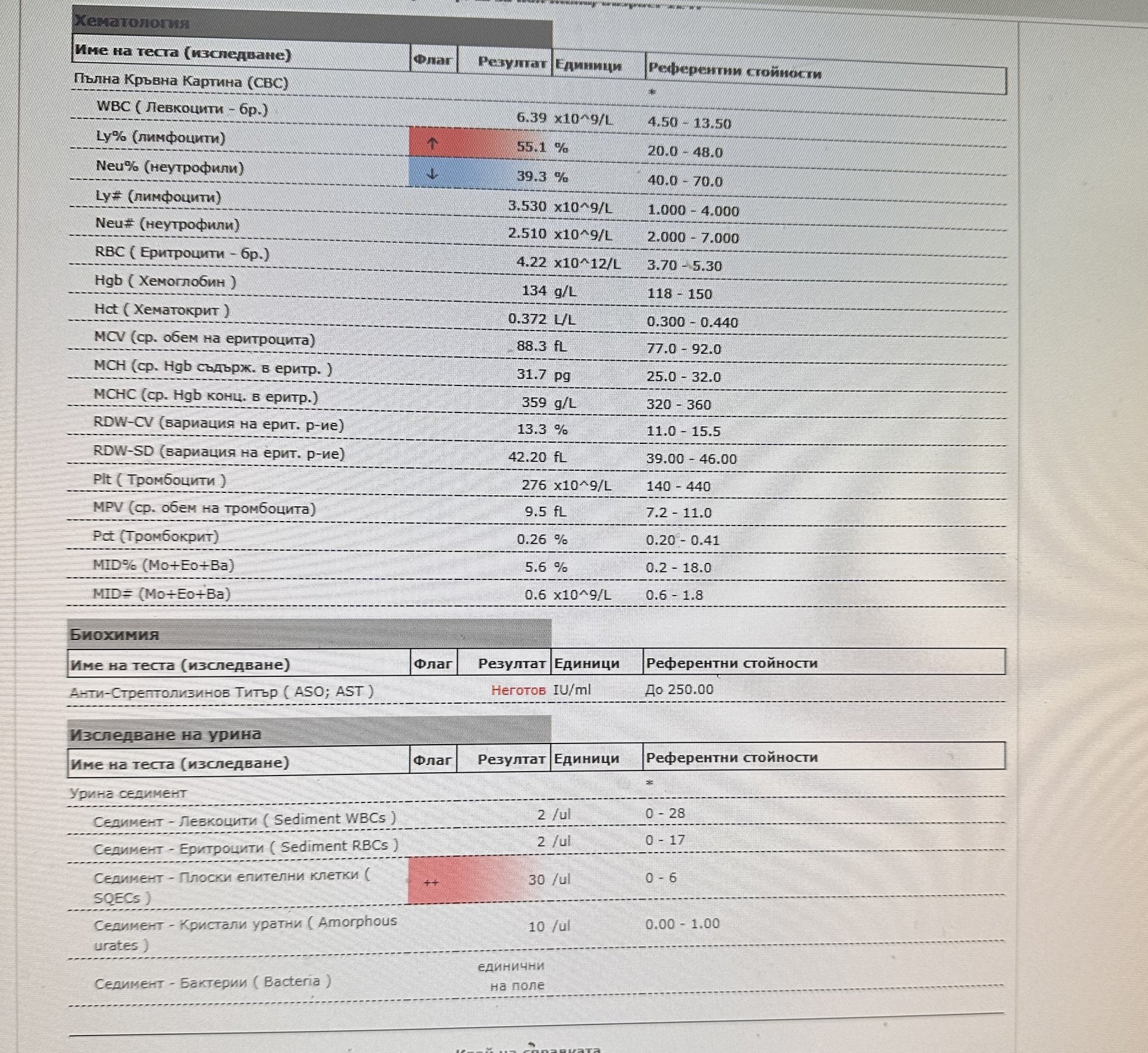 Като цяло са добри, с изключение на урина, в която се открояват доста плоски епителни клетки. Известен брой е нормално, но доста не е. Повторете теста с урината само, като се постарайте да я вземете правилно, без да замърсявате пробата. Ако резултатът е същият, консултирайте ЛЛ и/или АГ.