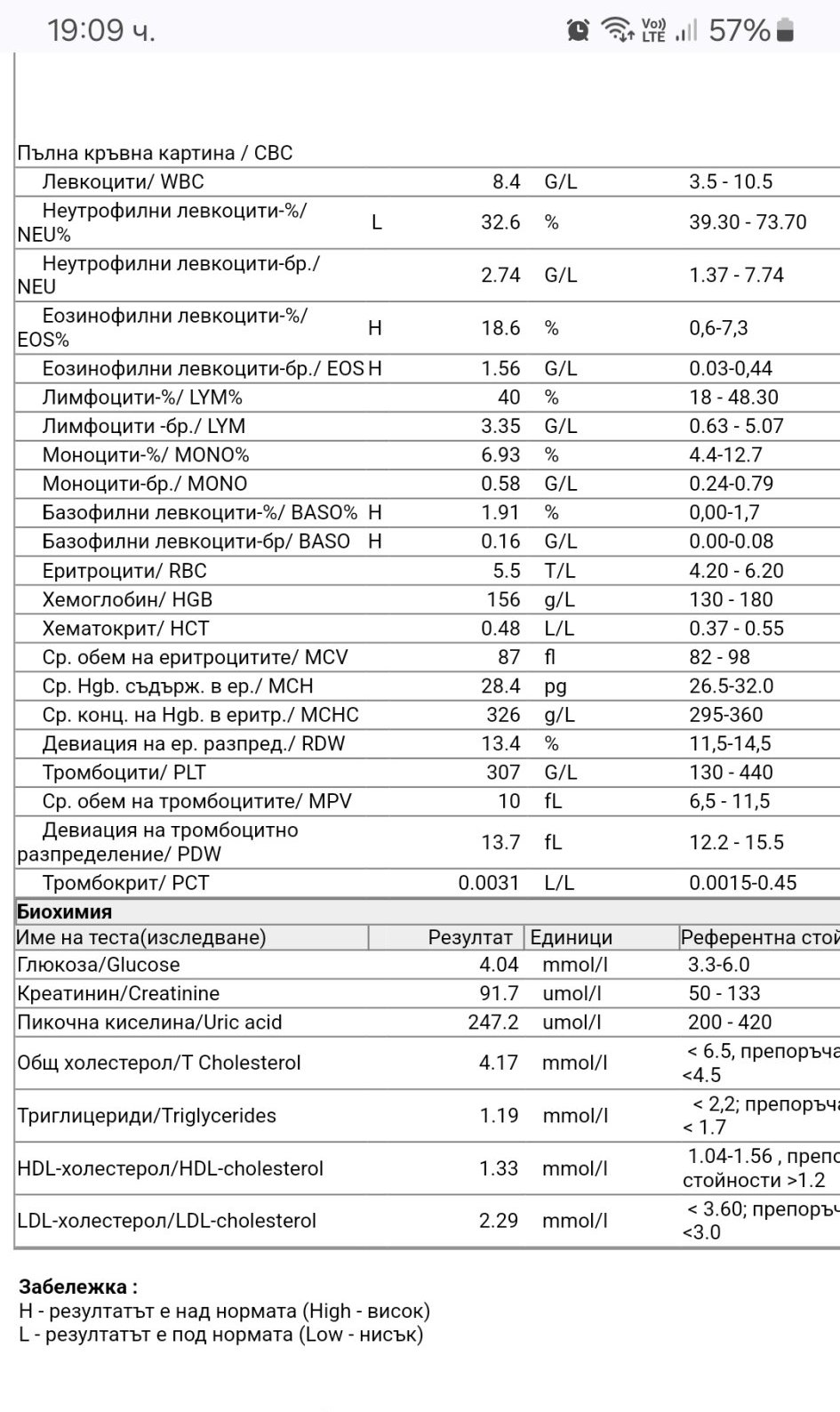 Здравейте! Може ли да коментирате показателите с отклонение (резултатите са от днес). Същите показатели бяха с подобни стойности и отклонения от ПКК  правена април 2023. На какво може да се дължи, явно не е моментно състояние? Необхидими ли са някакви допълнителни изследвания?