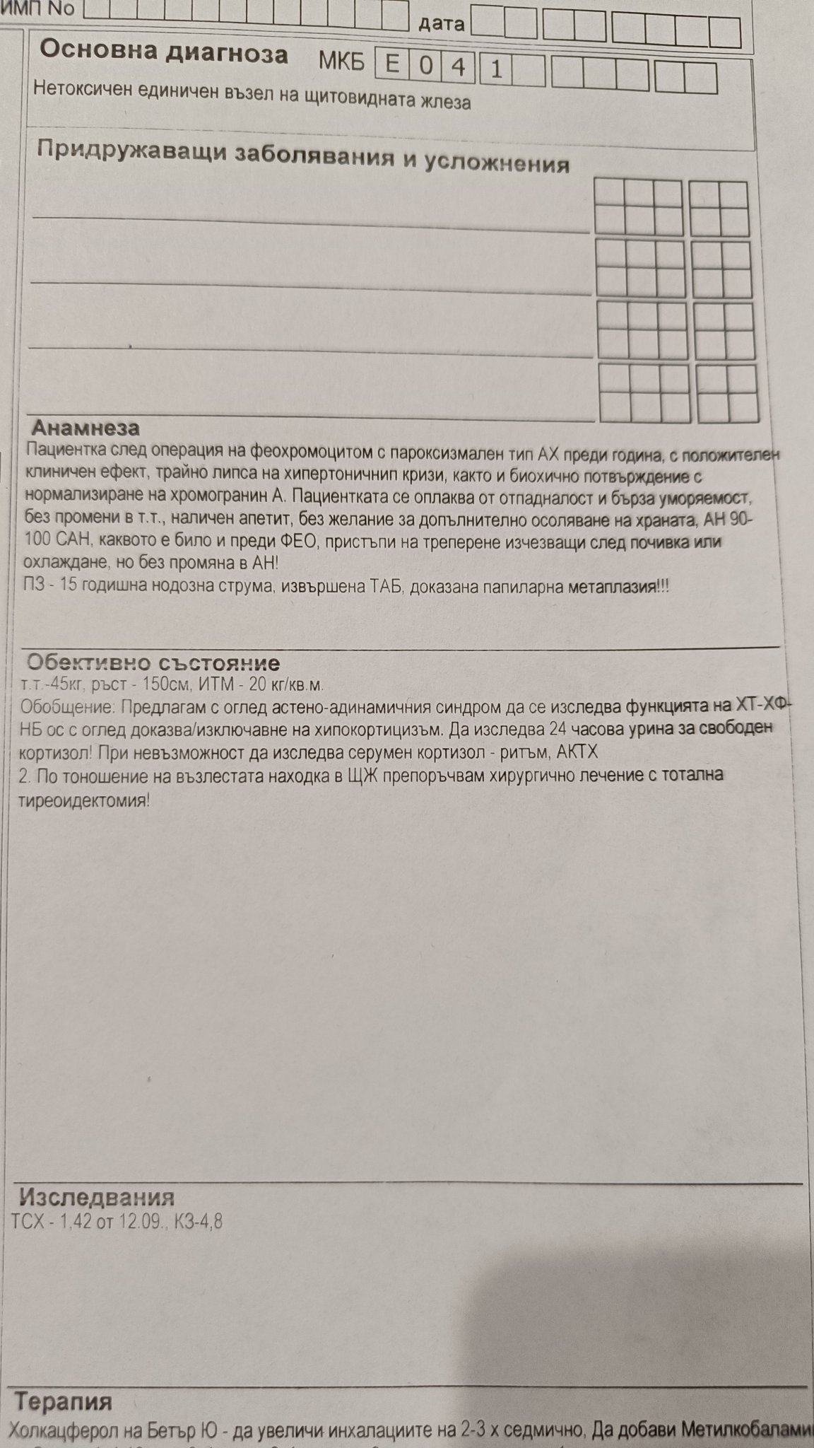 преди няколко дена ме посъветвахте да си направя ЯМР на хипофиза и хипоталамус. Това заключение направихте въз основа на това че съм оперирана от феохромацитом( отстранена ми е лява надбъбречна жлеза) и от биопсия на възел на щитовидна жлеза ми откриха папиларна неоплазия. Ендокринологът каза най напред да пусна изследвания и тогава ако се налага ще направим образно изследване. Имам някои симптоми които приличат на хипокортицизъм. Тъй като касата не поемала тези изследвания ще ги правя сама. Но във амбулаторния лист разчитам само кортизол като изследвания. Само него ли трябва да изследвам. Трябва ли да пусна и АКТХ,калий,натрий и нещо друго. Малко дълго се получи за което се извинявам. Благодаря!