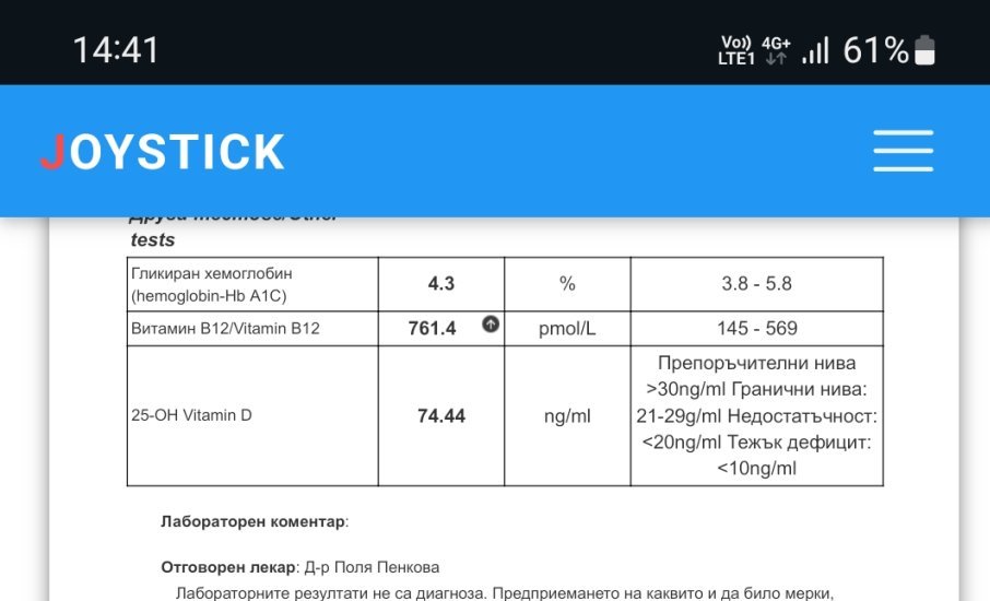 Браво и на лабораторията. Е това е една "умна" лаборатория. Погледнах им референтните стойности за вит. Д, за тези, които са по-наблюдателни, са забелязали, че има само долни граница на недостиг и дефицит, няма горна граница! Някой в тази лаборатория мисли трезво!