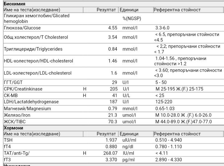 Здравейте, бихте ли помогнали с разчитането на резултатите, има преглед при ендокринолог за другата седмица. Момче на 15г., от 2г е с Хашимото и хипофункция, диагностицирано с изследвания и ехограф. Не е приемал хормон, а само активно спортуване. Досега ТСХ винаги е бил около 7-8, не знам сега как го е свалил. В текущите изследвания показва ли се нарушена функция на жлезата? И също тези CPK, CK-MB, притеснителни ли са? Последните дни не е спортувал.