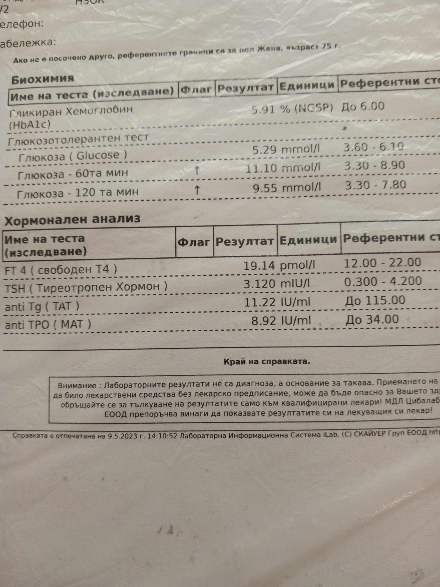 По другите въпроси. Преди тези изследвания, знаело ли се е, че жената е с преддиабет или сега сте го установили? Защото с 5.91 гликиран хемоглобин, правенето на орален глюкозен тест е изцяло излишно упражнение и само тормозите жената. Пределно ясно е, че за да стигне А1С до 5.91, инсулиновата резистентност е в напреднал вече стадий. Такъв тест е подходящ, когато А1С е сравнително нисък и би могъл да 'скрие' иначе развиващата се инсулинова резистентност. Специално този тест, не го пускайте скоро, следващата една година поне ще безсмислено.