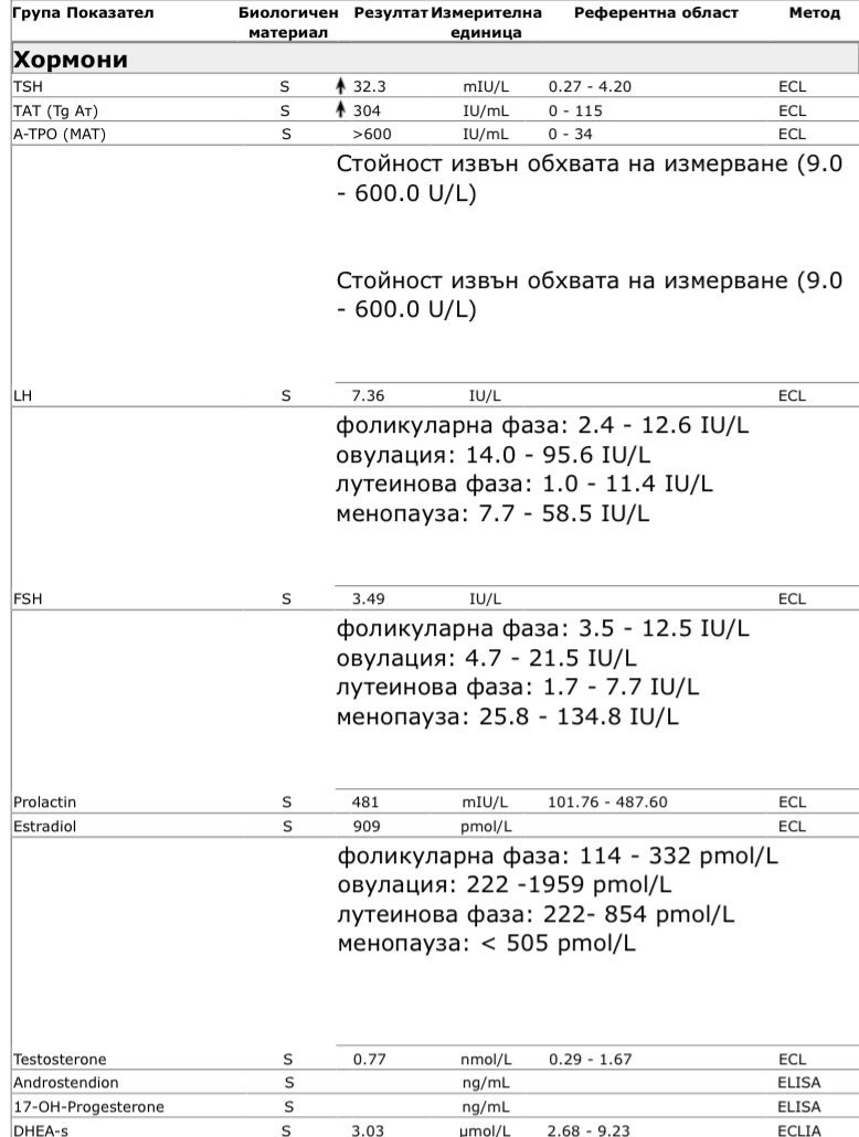Не знам защо липсват ФТ3 и 4 от щитовидната, но и без тях се вижда доста свирепо Хашимото.