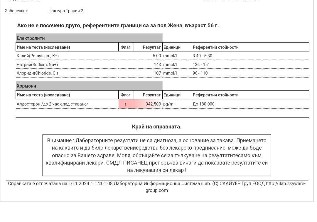 Всички маркери без алдестерон са нормални, което на мен ми говори, че най-вероятно не е болест на Адисон или хипералдостеронизъм, а по-скоро евентуален тумор на останалата ви надбъбречна жлеза. Сигурно ще искат да направят ново образно изследване, за да се потвърди. Може ендокринологът или нефрологът ви да искат да изследват ренин и АСЕ. Споменахте евентуални бъбречни проблеми. Не мога да се обвържа със 100% мнение, обаче. При вас случаят е особено сложен и многофакторен.