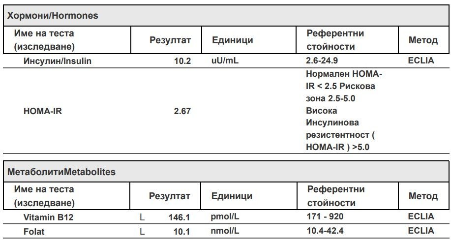 Iveta_S, изолират се няколко различни проблема, но този който най ме озадачава, е ниският фолат, особено след терапия. Формата на Б9, която сте приемали, метилирана ли е? Задължително трябва да се разшифрова острият дефицит на фолат, и то като приоритет. В момента сте в де факто функционален дефицит на Б9, което води до различни последствия, вкл. и биохимични. Кой е продуктът, който ползвате от Б-комплекса?