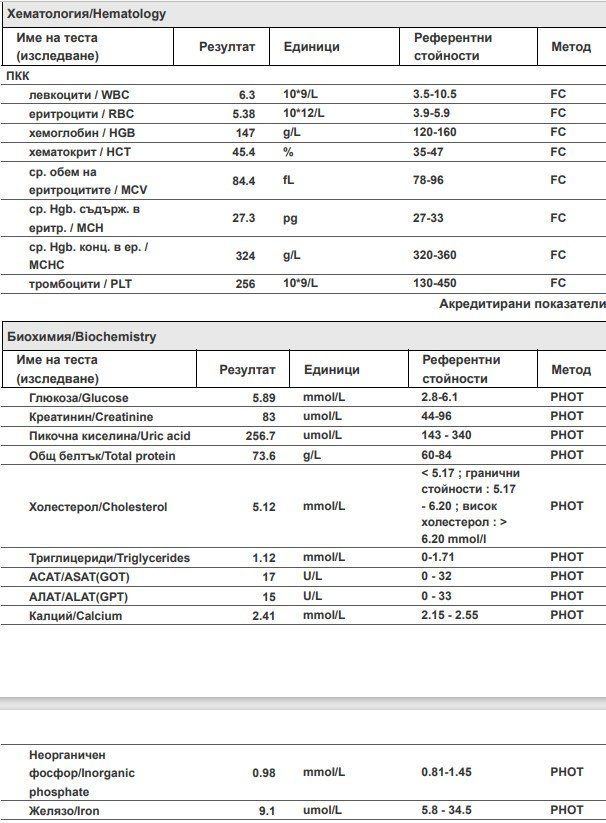Име на теста (изследване)   Флаг   Резултат   Единици   Референтни стойности