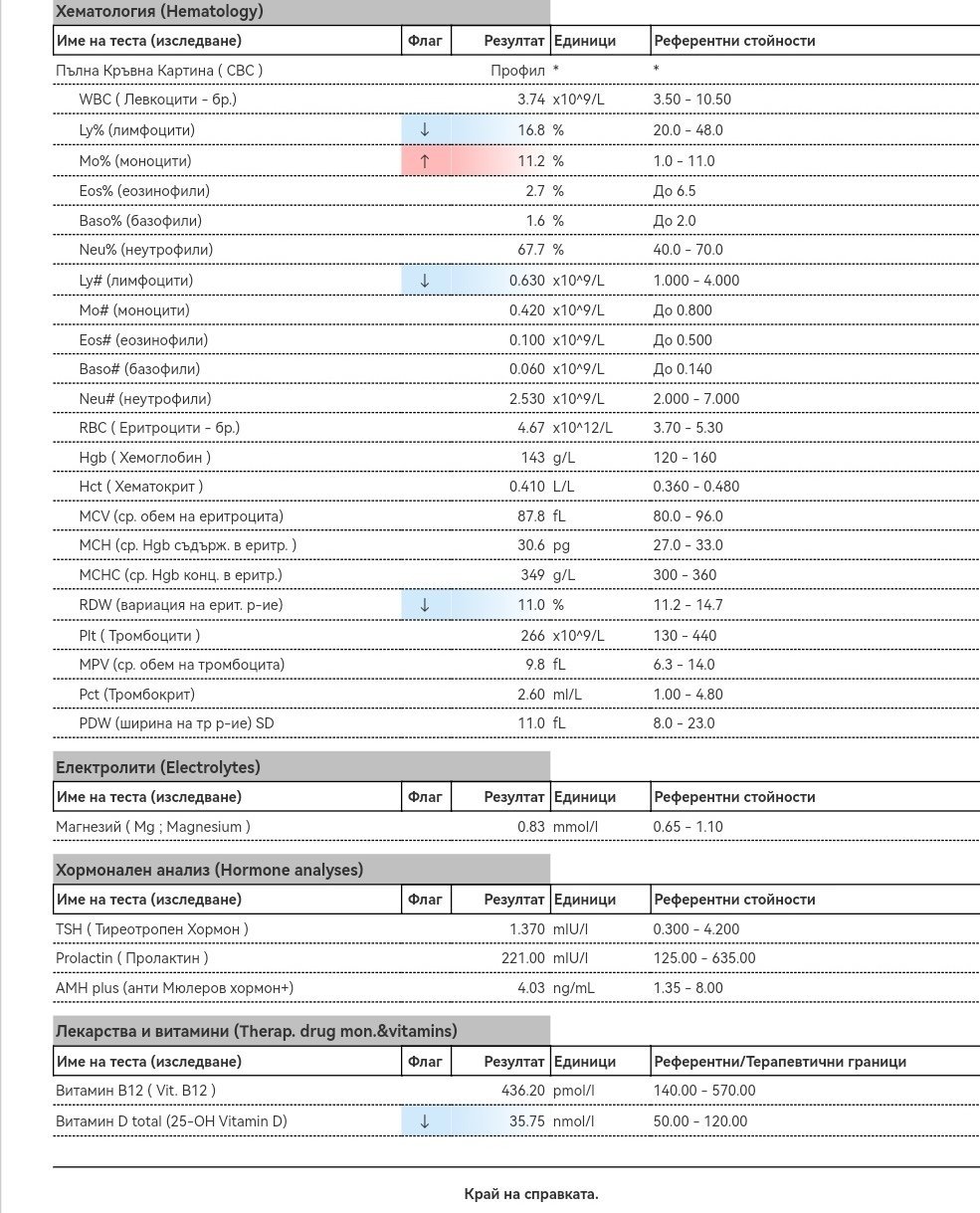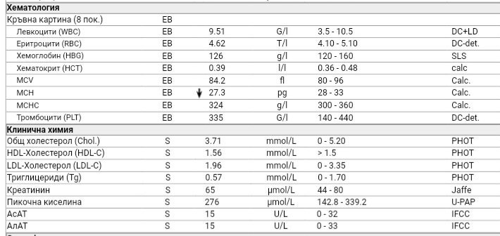 Име на теста (изследване)         Флаг                 Резултат                               Единици                       Референтни стойности