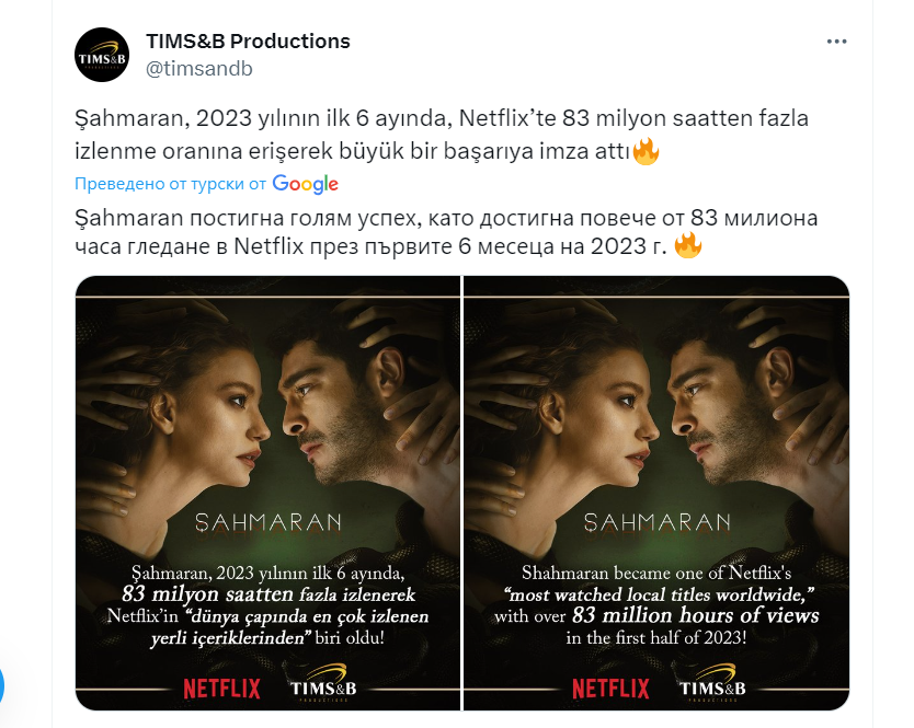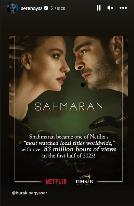 В списъка на най-гледаните турски продукции на Netflix  #Şahmaran  се класира на второ място с 83 600 000 часа