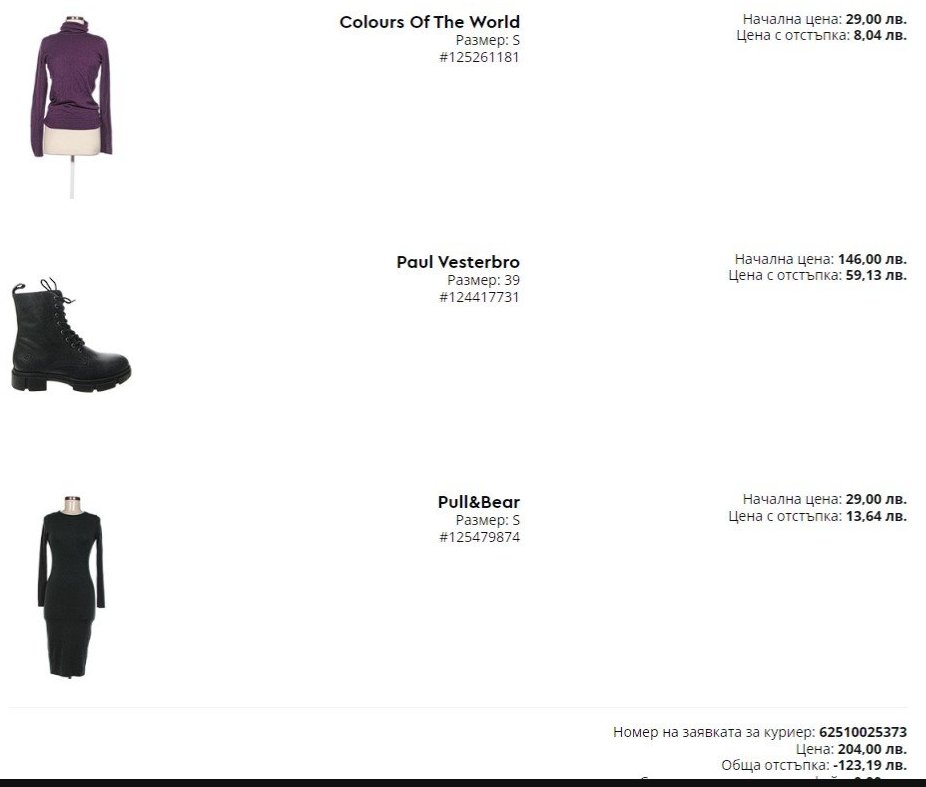 На мен вече ми изпратиха е-мейл за възстановяване на сумата само за артикулите,а не на пълната сума+"мазната" им доставка.Тия ме загубиха тотално като клиент.....Описала съм петната на роклята и разпраното на бието на блузата и през сайта.Крайно нагло,некоректно и  нелоялно отношение към клиента.