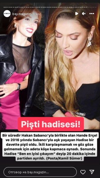 Жълтата преса твърди, че Ханде и Хадисе, която е била любовница  на Хакан Сабанджъ през 2016 г., са се засекли на партито. Хадисе е била поканена да пее там. Двете са се опитли да избегнат срещата си, но в един момент Хадисе си е тръгнала първа.