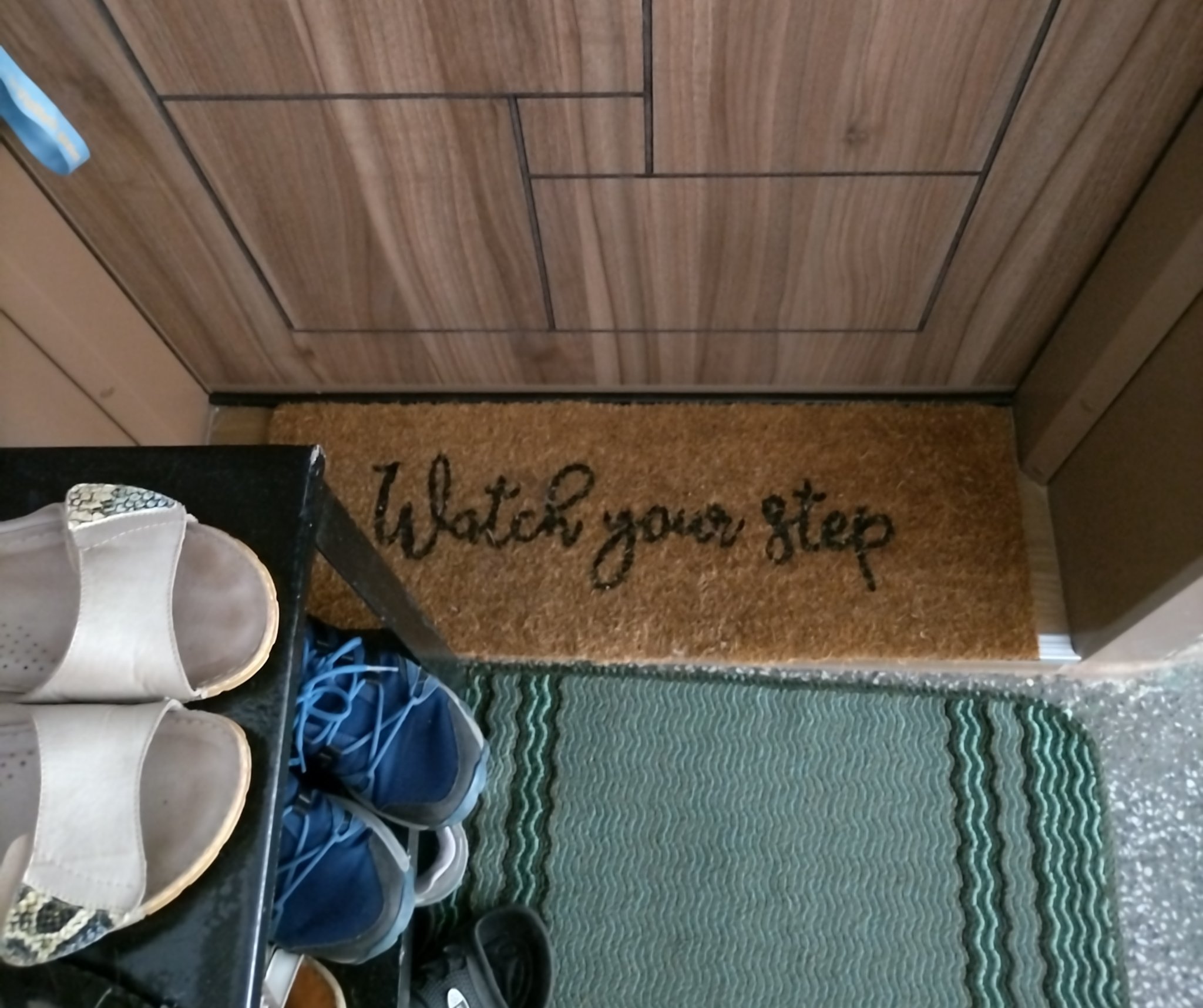 Ето пред нас. Имам пътека с надпис. На долната пътека която се пере често, се оставят обувките и на кокосовата от Мьомакс се стъпва по чорап. И вътре само без обувки. Дори гранитогреса няма пътеки и избягваме килими защото се набиват с косми и човешки прах, кожи. По-евтино ми е да купя хубава машина вертикална и да чистя гранитогреса. Това е друга тема. За гости майстори с калцуни. Innocent