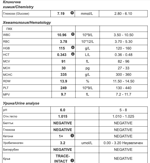 forest_girl, изцяло на гладно ли са дадени изследванията? Поне след 10 часа от последното хранене, без да си пила кафе, чай, да си яла бонбон? По принцип глюкоза на гладно 7,1 mmol/l се счита за захарен диабет и налага по-обстойно изследване. От урината няма някакъв значим повод за притеснение: кетони има, когато повръщаш, гладуваш или се приема определен медикамент, а следи от еритроцити само от едно уринно изследване не означава нищо. Пусни след 7 дни още едно и то най-добре уринен седимент. Хубавото е, че нямаш белтък. Така и така те боцкат, пускай си урея, креатинин и пикочна киселнина - и те се проследяват.