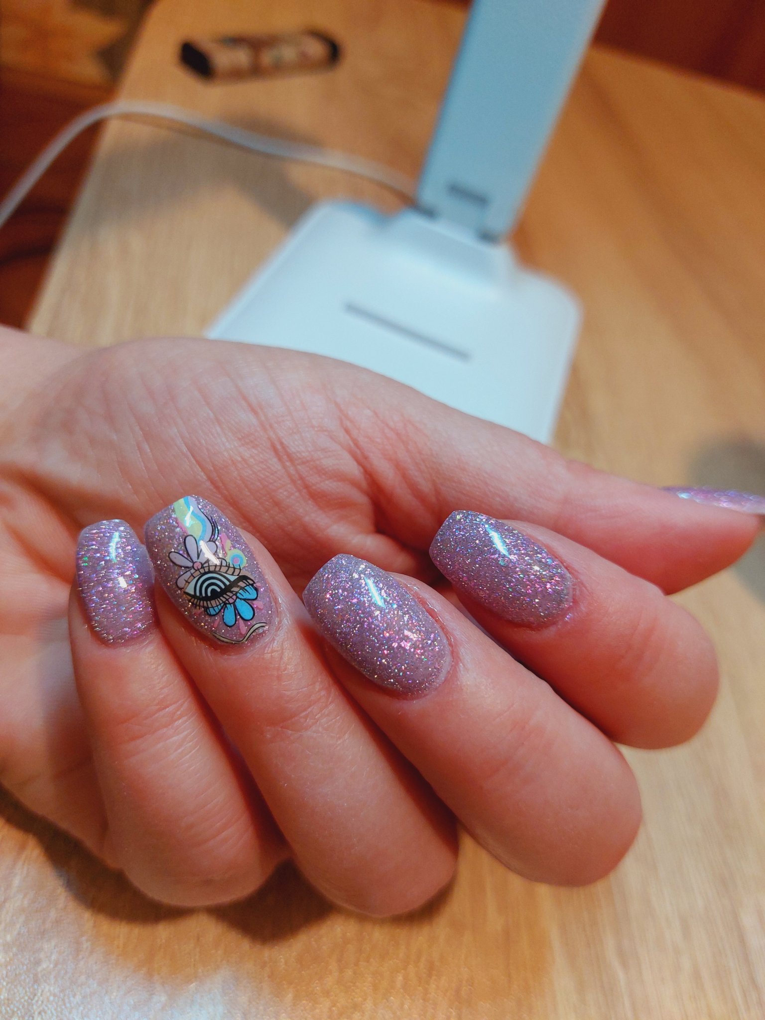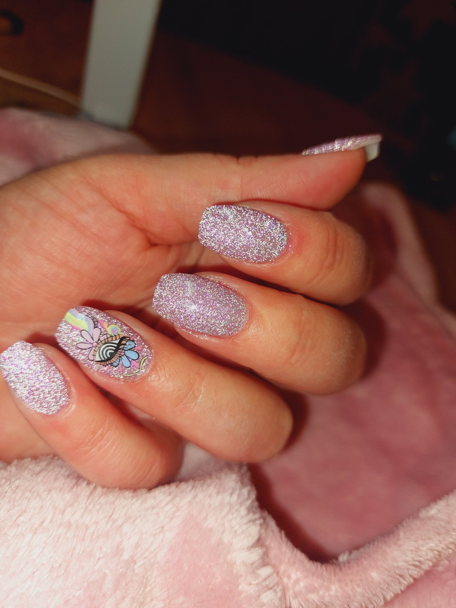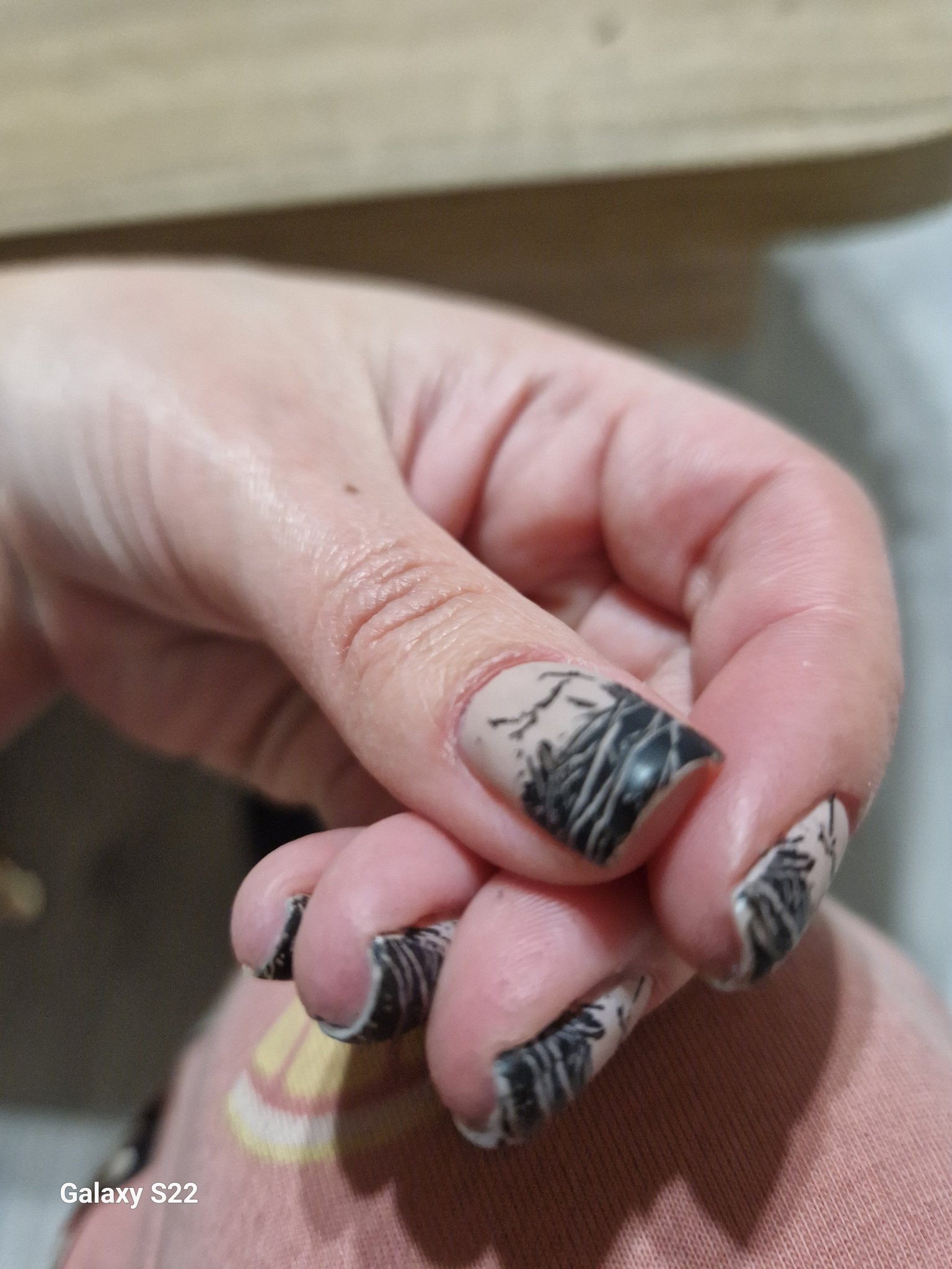 Но нали уж искам да си разходя повечето напоръчани неща, та реших междинно да плесна нещо отгоре, но преди това сложих тънък слой база на израстналото, за да няма лак по нокът. С този метод без мотаене може за около 30 мин да се обновите без много гимнастики, ако ви допада крайният резултат. Кожи не обработвах с пила, само избутах с римувър.
