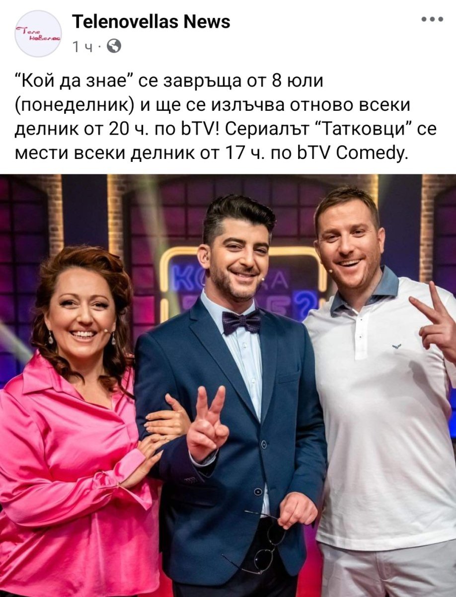 И аз много харесвам предаването. Смятам, че е забавно и образователно. Милица и Пъдев са харизматични и създават страхотна атмосфера, а Сашко Кадиев ги допълва...Увлекателно предаване. Не усещам кога минава времето.. .Не помня откога не съм гледала ТВ предаване с такъв интерес и наслада.  Неангажиращо и разтоварващо е,  но в същото време успява да ми впрегне мозъчните клетки и да науча нещо ново. Simple SmileSimple SmileSimple Smile Дано да има още и още, и още сезони.